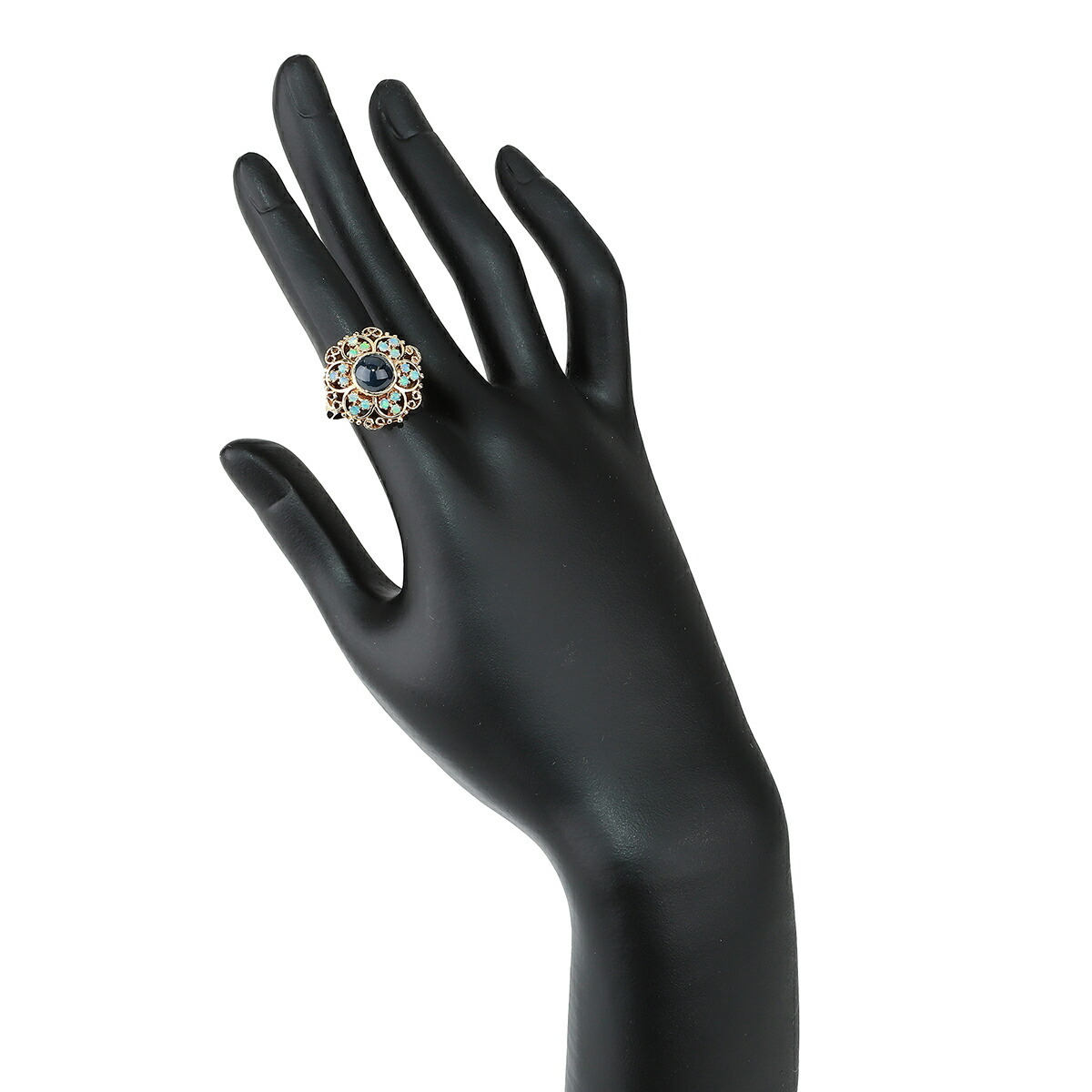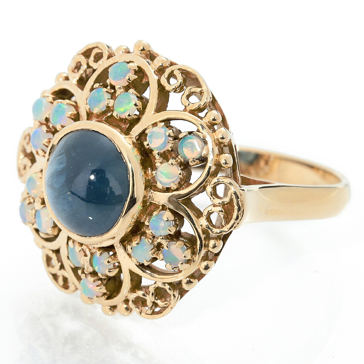 中央で静かに輝くサファイアと、その周囲を彩るオパールの花びらが織りなす、可憐なフラワーモチーフリング。華やかさの中にも落ち着きを感じる佇まいは、まるで時を超えて愛され続けてきたような、クラシカルな魅力を感じさせます。