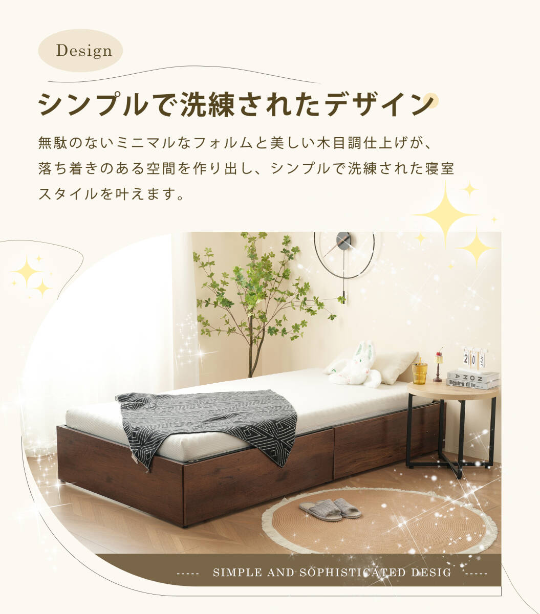 • 【安心へのこだわり】無駄のないミニマルなフォルムと美しい木目調仕上げが、落ち着きのある空間を作り出し、シンプルだからこそ、どんなインテリアにも馴染みやすく、洗練された寝室スタイルを叶えます。