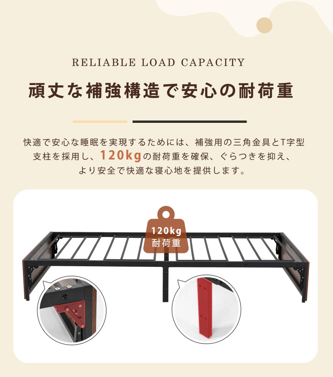 • 【頑丈な補強構造で安心の耐荷重】快適で安心な睡眠を実現するためには、補強用の三角金具とT字型支柱を採用し、120kgの耐荷重を確保、ぐらつきを抑え、より安全で快適な寝心地を提供します。