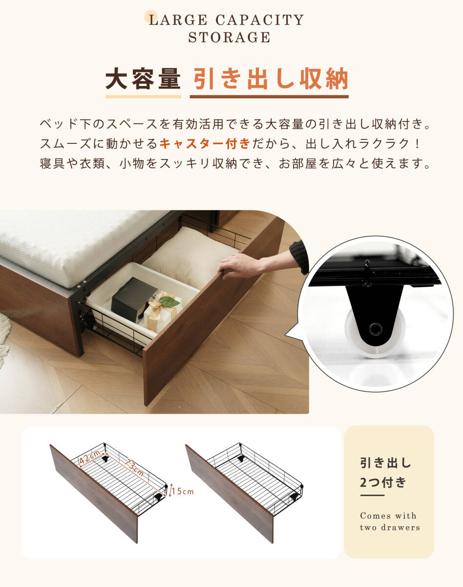 • 【引き出し2つ付き】ベッド下のスペースを有効活用できる大容量の引き出し収納付き。スムーズに動かせるキャスター付きだから、出し入れラクラク!寝具や衣類、小物をスッキリ収納でき、お部屋を広々と使えます。