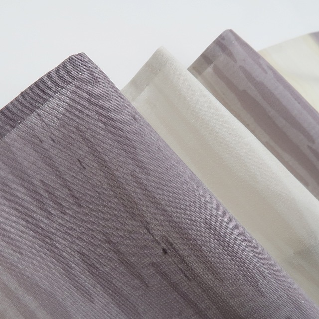 紗は二本の経糸で緯糸一本ずつをからめて織り上げたシンプルなもじり織で絽以上に透け感があり、カジュアルからセミフォーマルまで幅広く着られる夏生地のひとつ、織り柄のある紋紗、紬糸を使った紬紗などがあります。また紬は、一般的に糸の状態で染めてから織柄を入れる“先染め”の着物。通常の生地と比べて軽い質感が特徴、また滑らかな地風がシャリ感とともにさらりとした着心地を実感させてくれます。