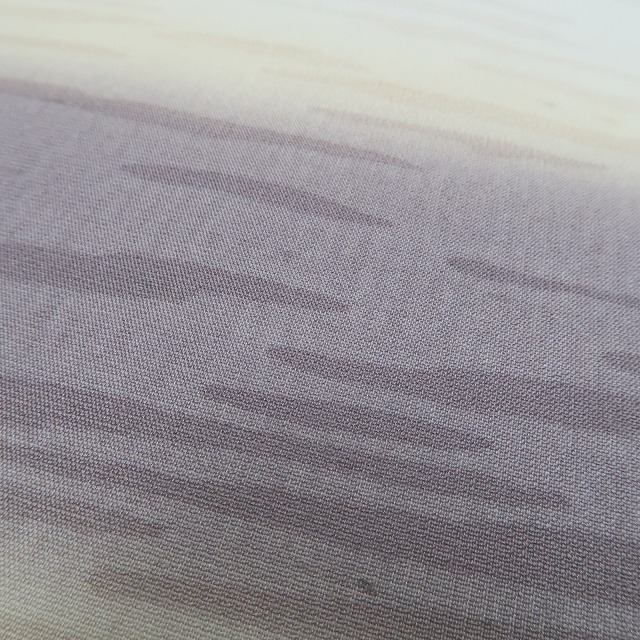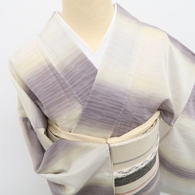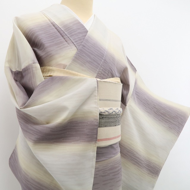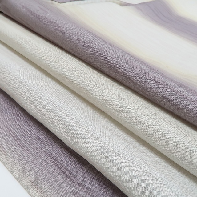 こちらのお着物は、夏紬の素材感にフォーカスしたシンプルな横段暈しを込めています。ぼかしは、優れた色彩感覚と繊細さが必要とされる染色方法のひとつで、優しい色合いの絶妙なグラデーションがなんとも言えない幻想的な仕上がりを創り出します。