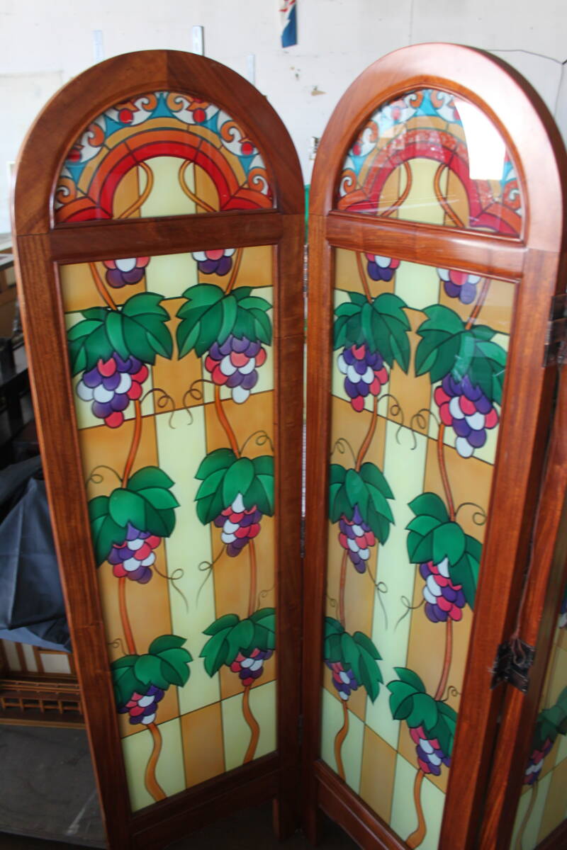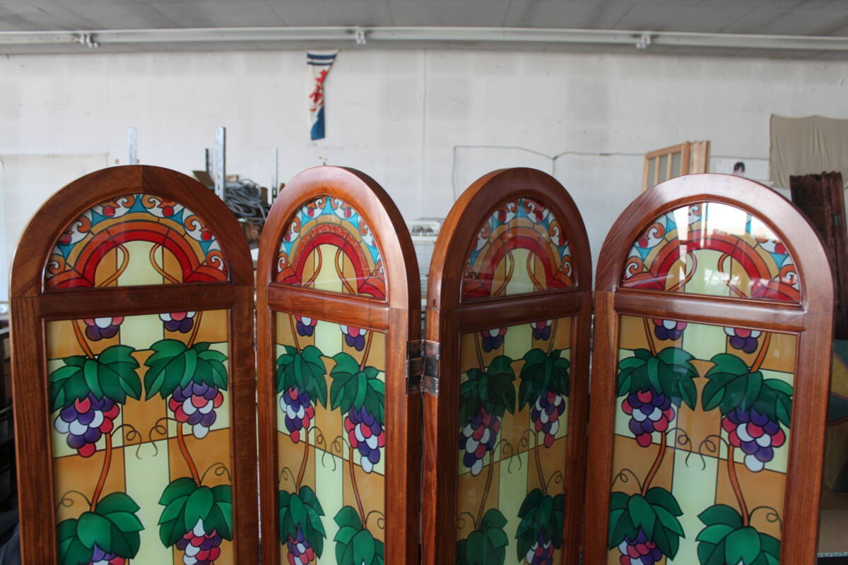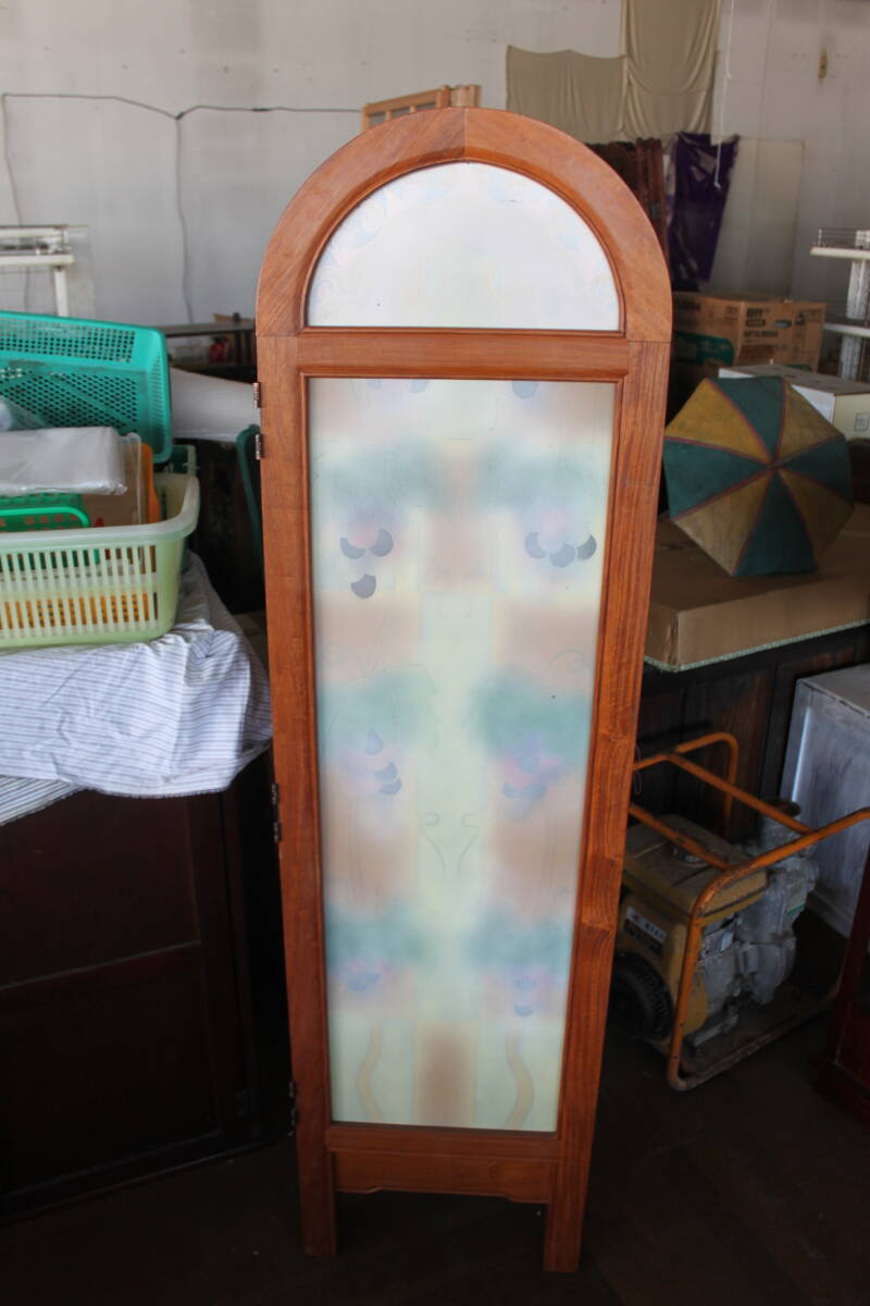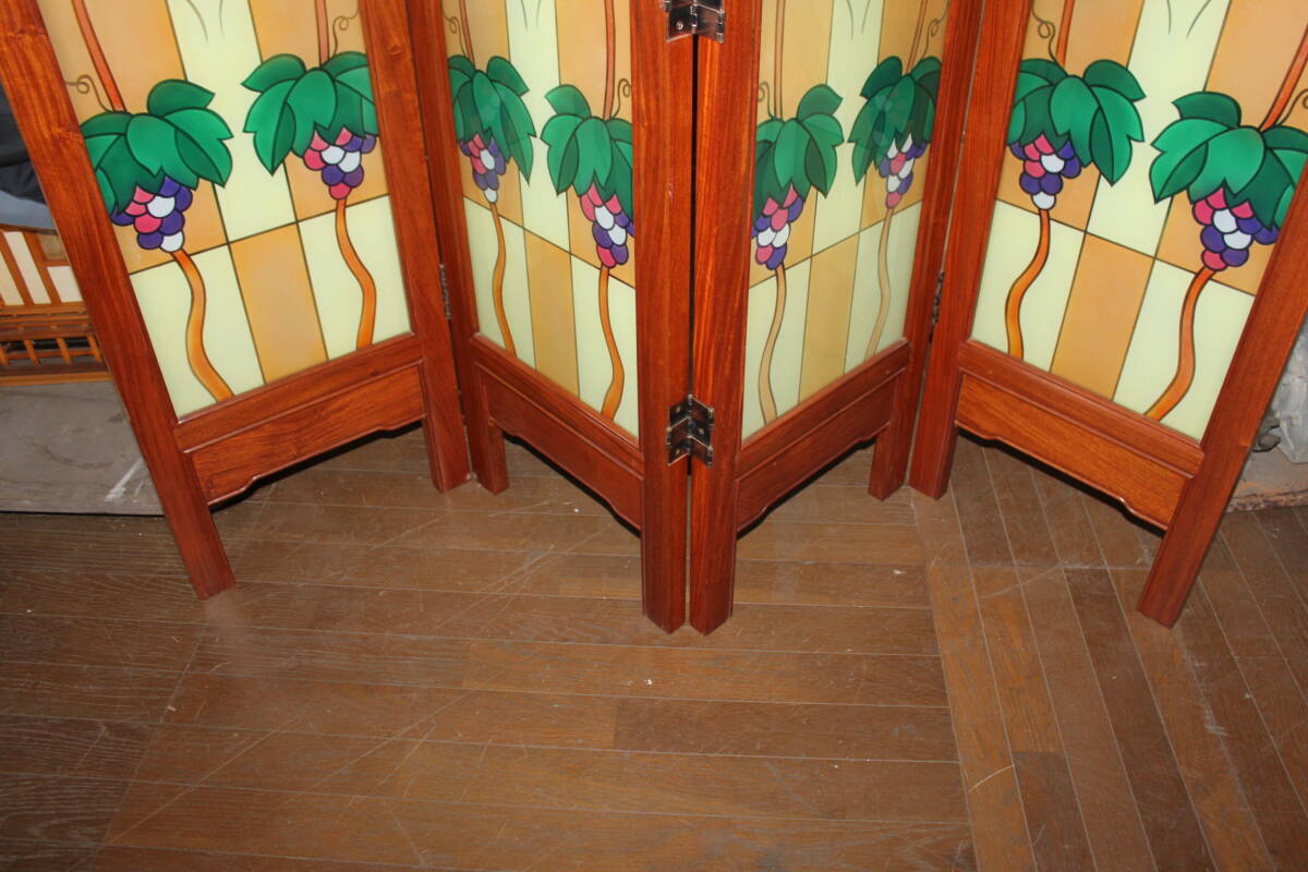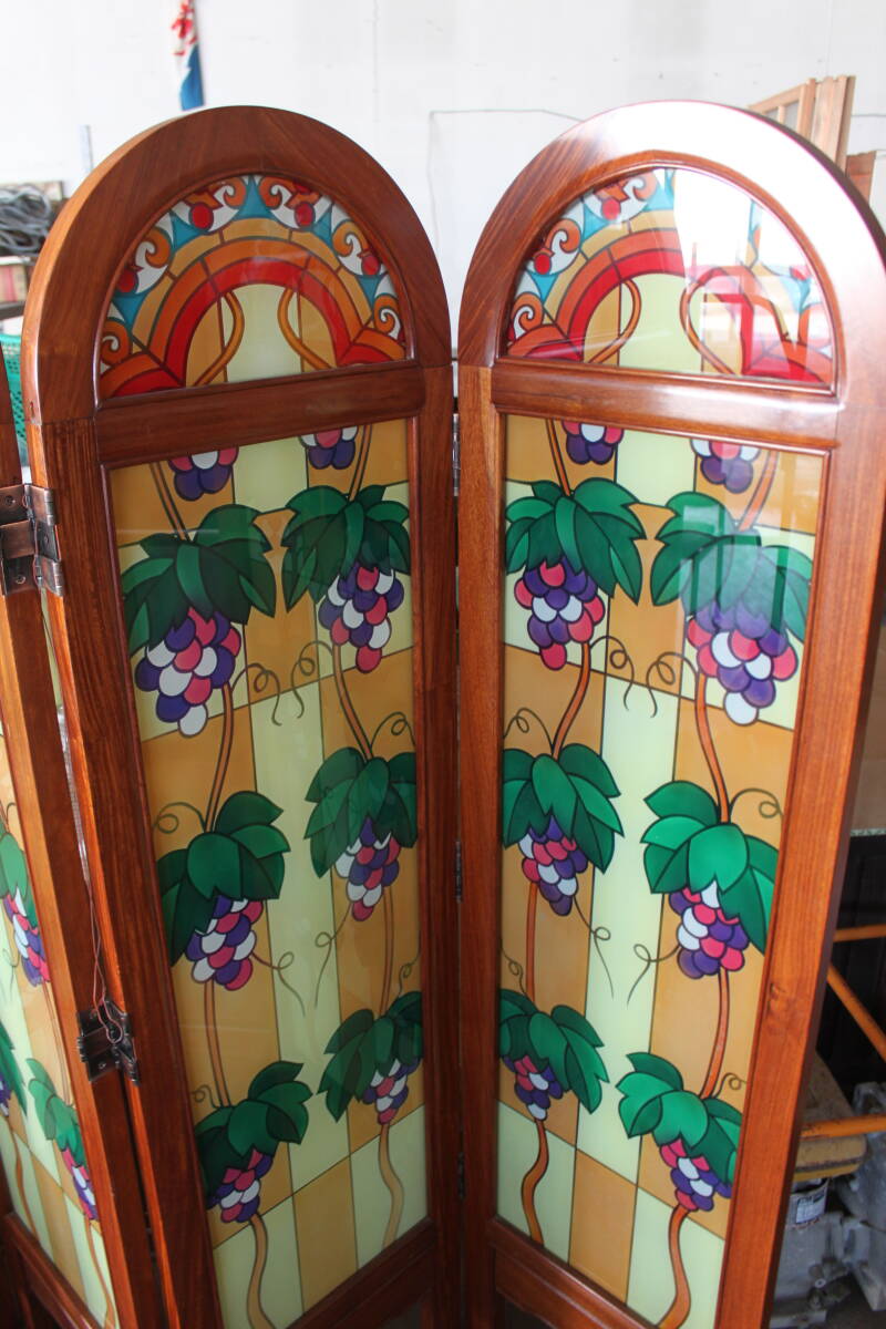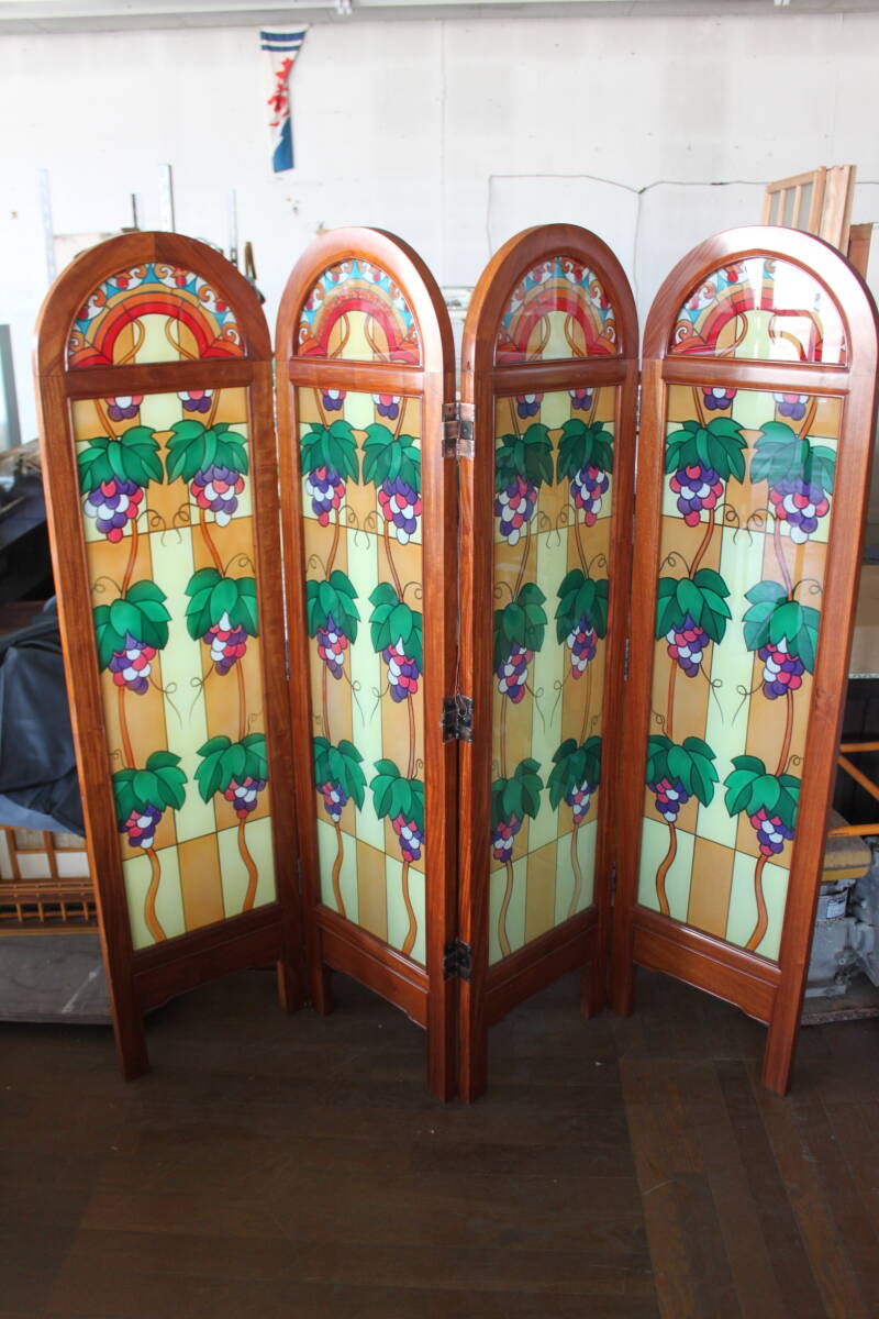 ■■■商品説明■■■ 四曲衝立の出品です。 作品は葡萄図が描かれたガラス絵が入った立派な衝立です。 <状態> 経年による汚れ、スレがあります。 商品は画像のもので全てです。 画像でご判断いただける方のご入札をお願い致します。 こちらは中古品になりますので、充分ご理解のうえご入札よろしくお願いします。 ■■■サイズ(実測)■■■ 一枚のサイズ 高さ約150cm×幅約40cm×厚さ約2.6cm 全体重量:約50kg ★当方、古いものを主体として出品させて頂いております。 点検は致しておりますが汚れや傷等の見落としがある場合がございます。 ご了承の上よろしくお願い致します。 ★発送詳細 ・佐川急便フリーサイズの予定です。 ★支払方法 ・Yahoo!かんたん決済 他にも色々出品しています。よろしかったらご覧になってください。
