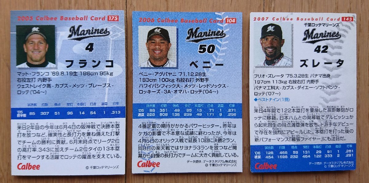 【カード・カルビー】フランコ 2005年175 / ベニー 2006年104 / ズレータ 2007年143 計3枚セット 千葉ロッテマリーンズ