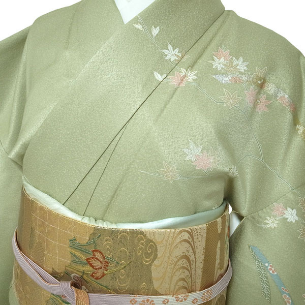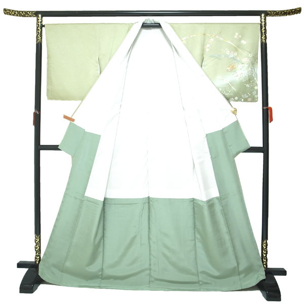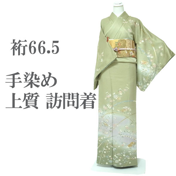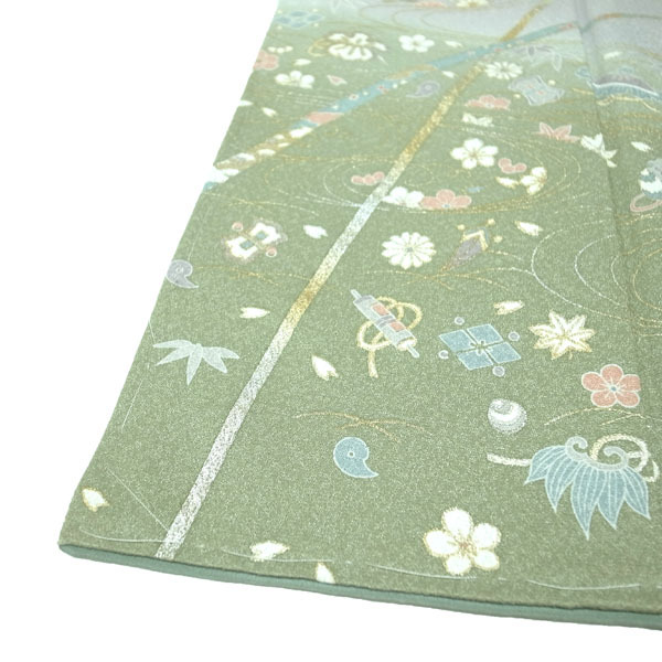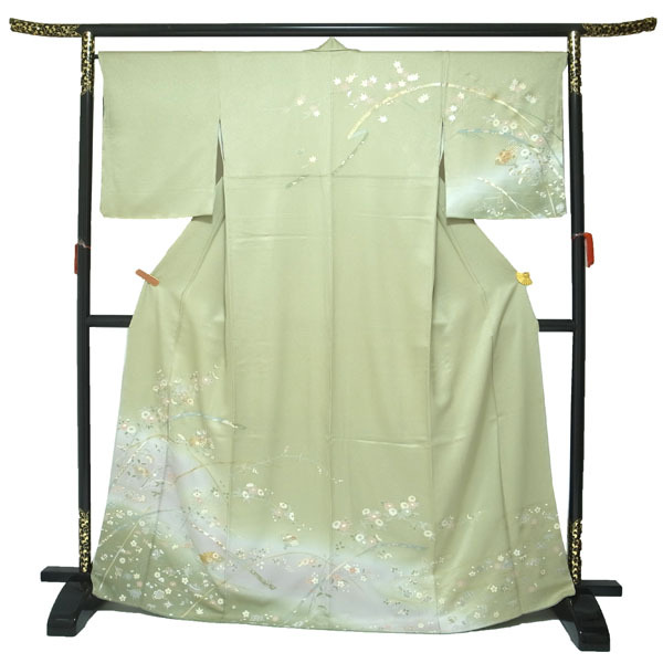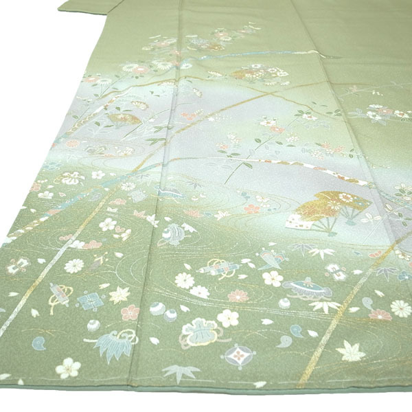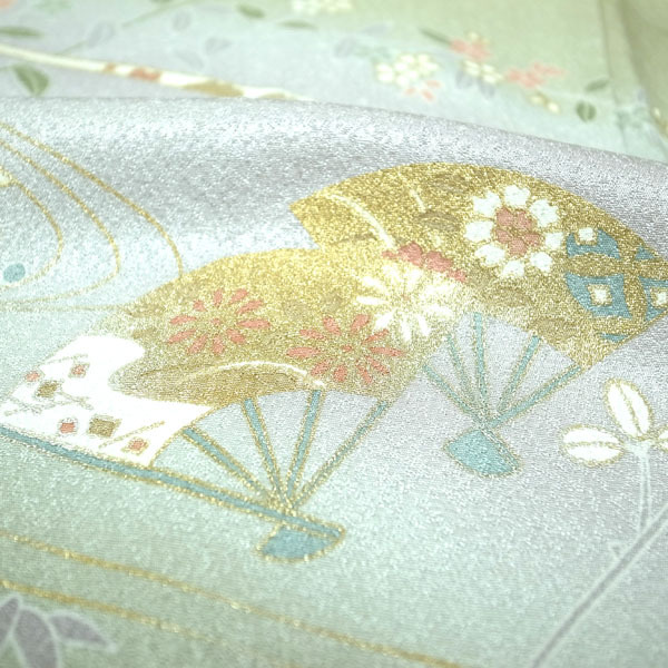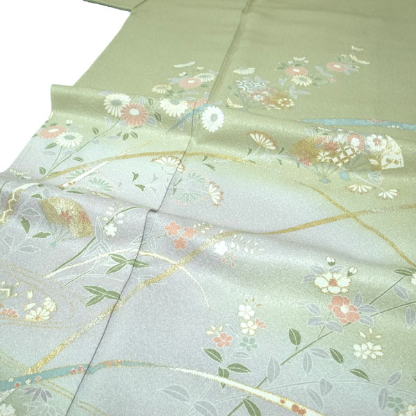 訪問着 着物 袷 金彩加工 手染め 淡緑 四季の花 宝尽くし 扇 流水 古典柄 フォーマル 結婚式 お茶会 七五三 入卒式 春秋冬 正絹 絹 美品 きれい 綺麗 キレイ 未使用品 未使用 なごみ 身丈167 裄66.5 Lサイズ 新古品 仕立て上がり品 sn1509