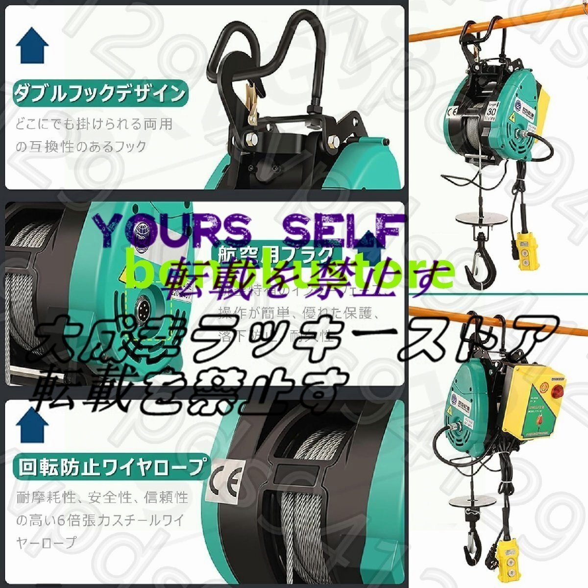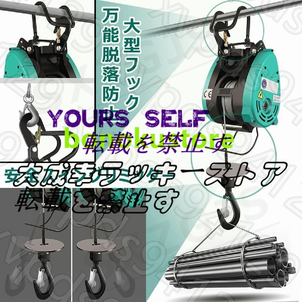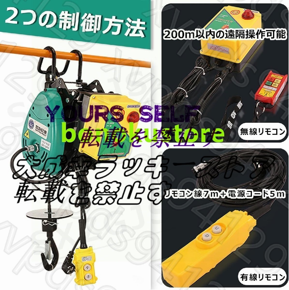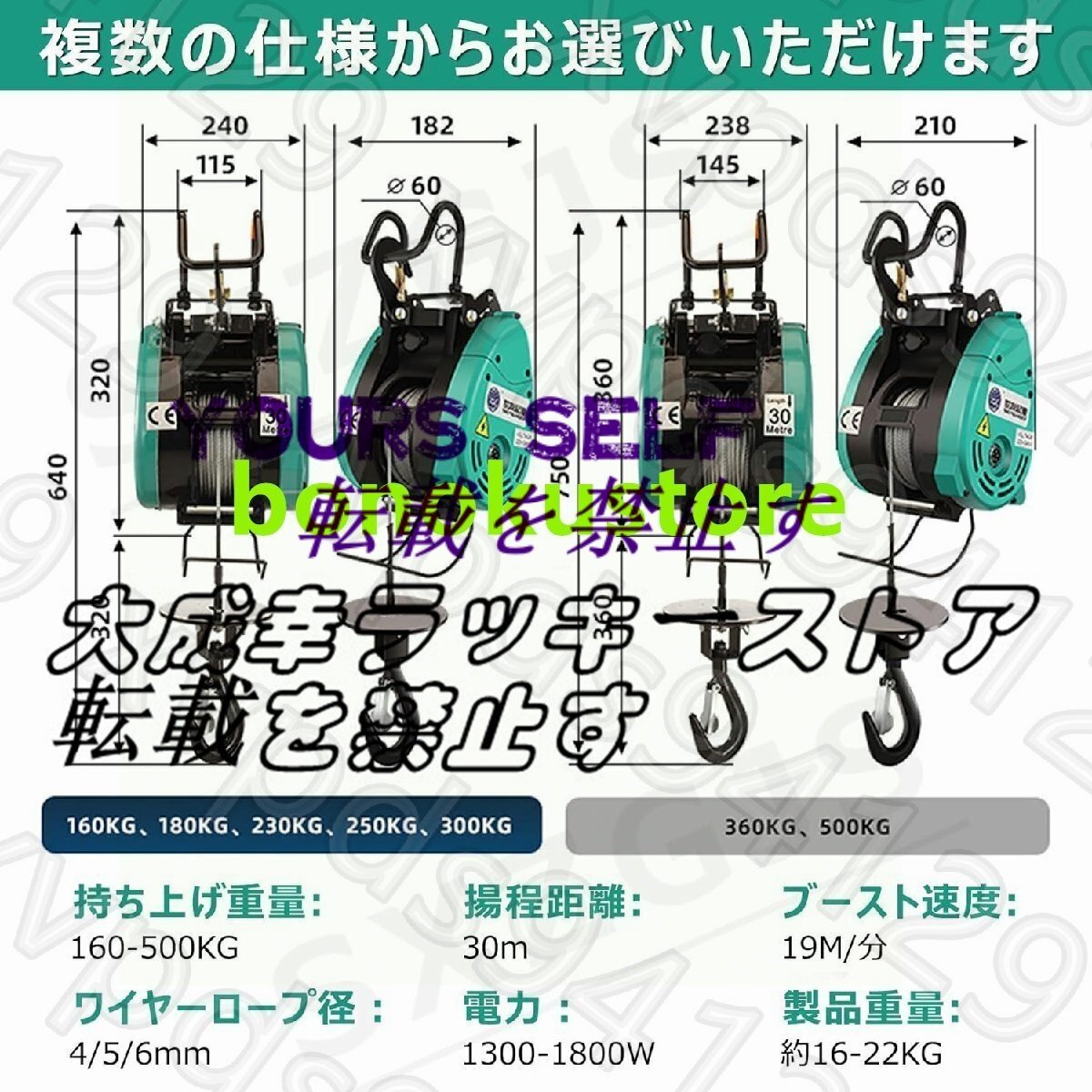 【優れたパフォーマンス】複数のオプションからお選びいただけます。 最大出力1800Wの強力なモーターを搭載し、高品質の全銅モーター+マンガン鋼強化ギヤセット+亜鉛メッキ鋼線ロープの組み合わせにより、クレーンの耐久性と長寿命が保証されます。最大荷重は500kgで、高さ30メートル(約10階建て)の物体を持ち上げることができ、速度は19メートル/分に達します。 さらに、開始速度と停止速度が遅いため、動作中の負荷ジッターが減少します。