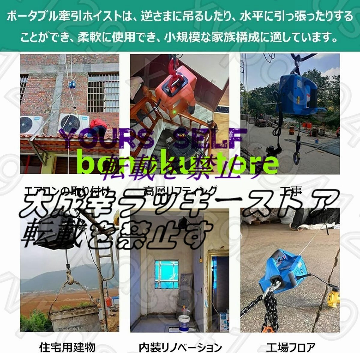 【軽量で持ち運び便利】手で持ち運べる小型電動ウインチです。 現場への持ち運びも簡単です。 倉庫、ビル群、自動車整備、設備移動などの重量物の吊り上げに最適です。