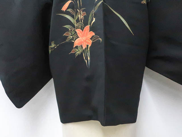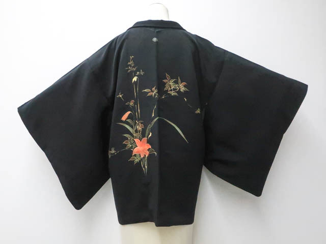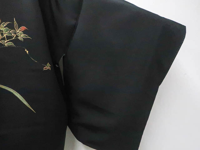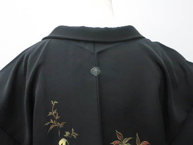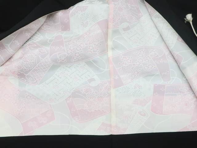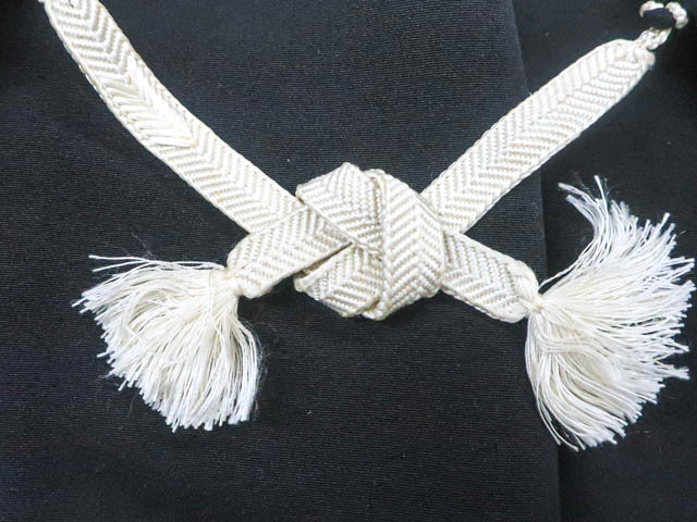 | リサイクル商品のため、紐に薄しみと後身薄汚れがございますがご着用いただけると存じます。 地色は 黒です。 1枚目の画像が近いお色かと思われます。 素材は正絹です。 |
