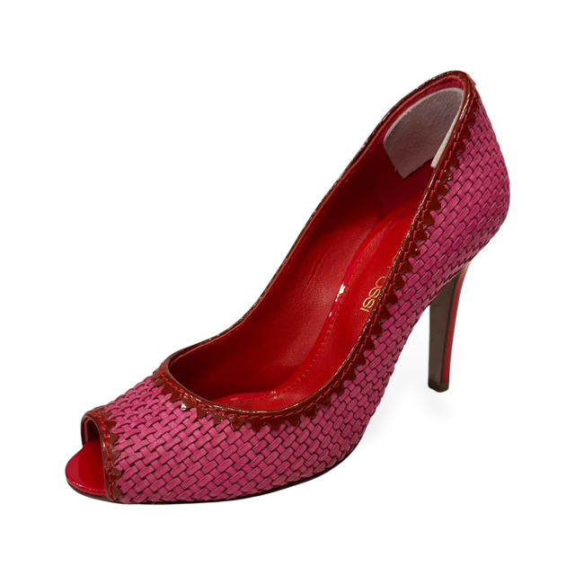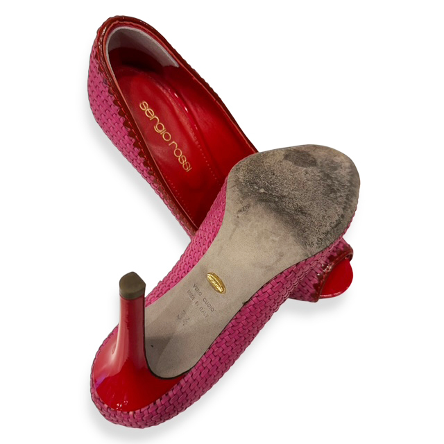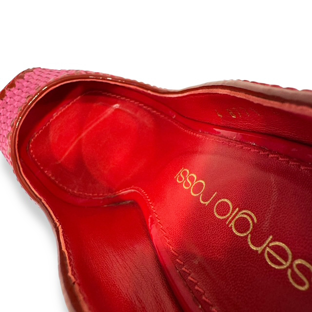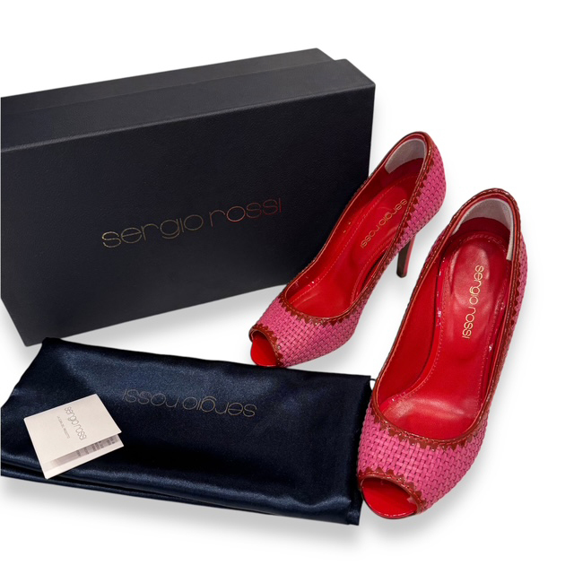 ■2回のみ着用/Sergio Rossi/セルジオロッシ/イントレチャート・オープントゥパンプス/ピンク×レッド系/34■
