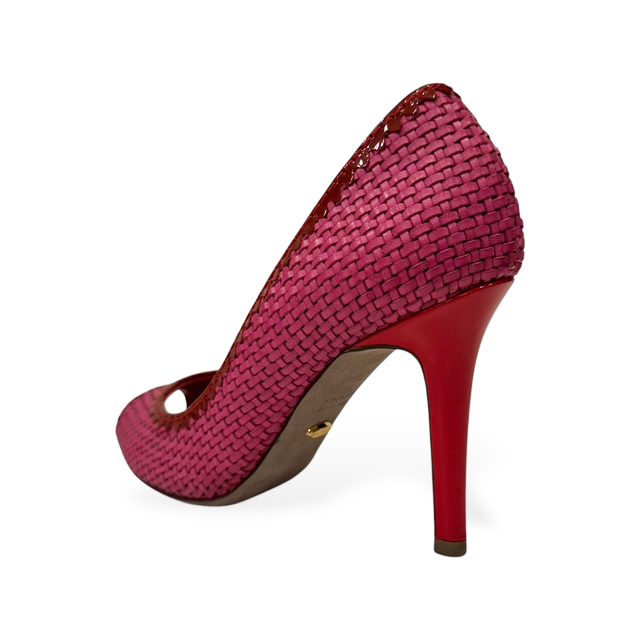 アッパーは革が籠編みされており、縁だけパテントレザーでトリミングされています。