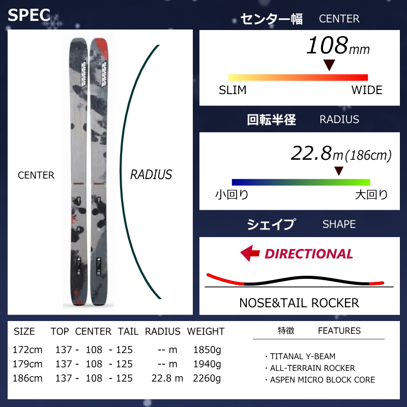 チターナルYビームによる高速でもブレない安定性とパウダーにも対応する走破性の高いセンター幅の組み合わせでコンディションを問わず、スピーディーなターンが存分に楽しめる1台。ずらしや小回りにも対応した操作性の高さで、あらゆる斜面でアグレッシブなライディングが楽しめるセミファットスキーです。