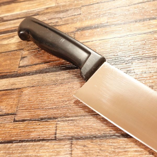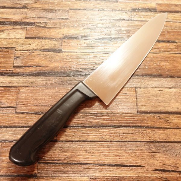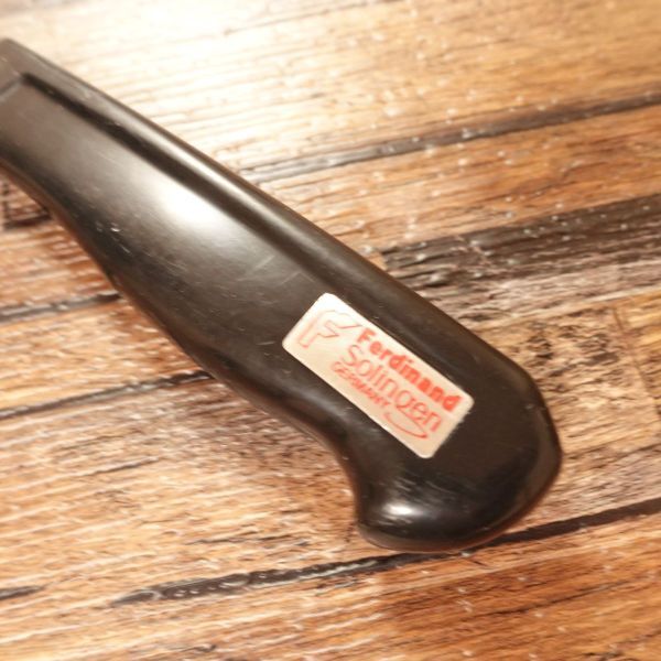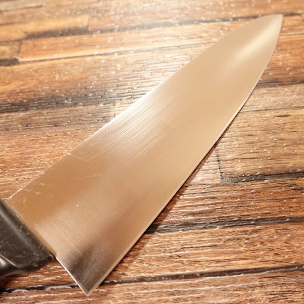 牛刀は、肉・魚・野菜など幅広い食材に対応できる万能包丁で、家庭用としてもプロ用としても人気のある形です。ドイツ、ゾーリンゲン製のステンレス包丁です。柄にはシールも残っており使用感ほぼ感じません。