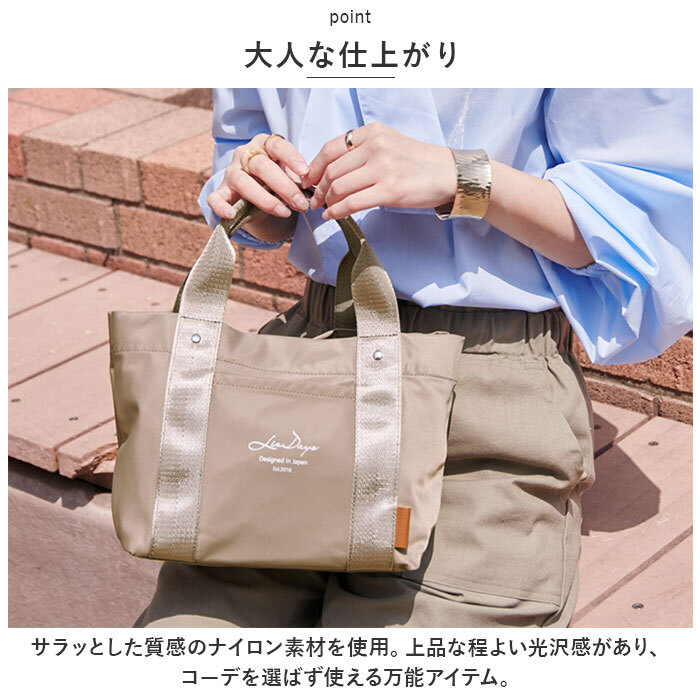 | 商品説明 | ・・デイリー使いにぴったり。手軽に持ち出せて、整理整頓もラクラク!ナイロンタイプの「仕切り付きミニトートバッグ」が新登場。 ・【大人な仕上がり】 ・サラッとした質感のナイロン素材を使用。上品な程よい光沢感があり、コーデを選ばず使える万能アイテム。 ・【軽やかな使い心地】 ・お出かけのマストアイテムが、すっきり収まるミニトート。体にかかる負担を軽減する軽量設計で、長時間の移動もストレスフリー。 ・【オープン開口】 ・開口部はガバっと開くオープンタイプ。中身が見やすく、取り出しもスムーズ。 ・【仕切り付きの3ルーム仕様】 ・内側は3ルームに分かれており、急いでいる時も中身がひと目で確認できて誰でも収納上手に♪仕切りは荷物の大きさに合わせて調節できる可動式。 ・【B5サイズ対応の大ルーム】 ・B5サイズのノートが横向きにすっぽり。長財布や本も収納OK。 ・【使い勝手の良い中ルーム】 ・ミニポーチやサニタリーグッズ、コンパクトなお弁当箱などが収まるサイズ感。 ・【ペットボトルが収納できる小ルーム】 ・ペットボトルや折りたたみ傘を縦向きに収納。倒れる心配なくサッと取り出せて、とっても便利。 ・【小物が迷子になりにくい!】 ・内側と外側に1つずつポケットを装備!移動中も、小物が取り出しやすいつくり。 ・【使い方いろいろ】 ・お出かけにはもちろん、ランチバッグやお散歩などにも。色んなシーンで活躍! ・【ちょっとの雨なら大丈夫】 ・両面に水滴や汚れを弾く撥水加工済みで、お手入れも拭き取るだけ。(※完全防水ではありません。) ・【お気に入りをチョイス】 ・コーデに馴染みやすい、落ち着きのあるカラーをラインナップ。年代問わず持ちやすいデザインも魅力。 ・【ポケット仕様】 ・内側:オープンポケット×1 ・前面:オープンポケット×1 |
