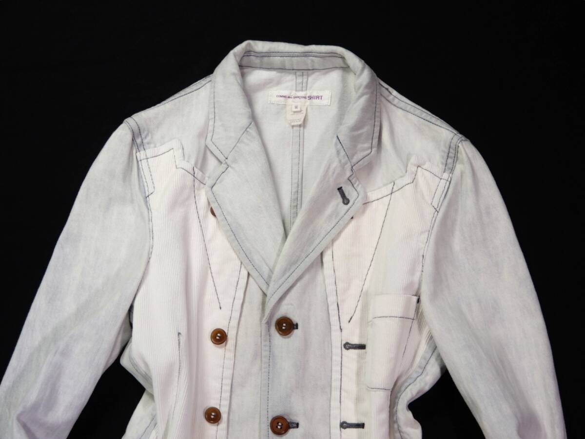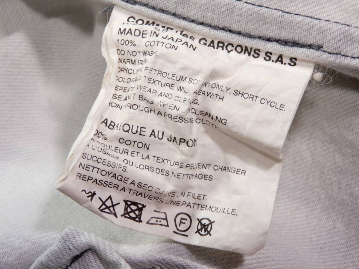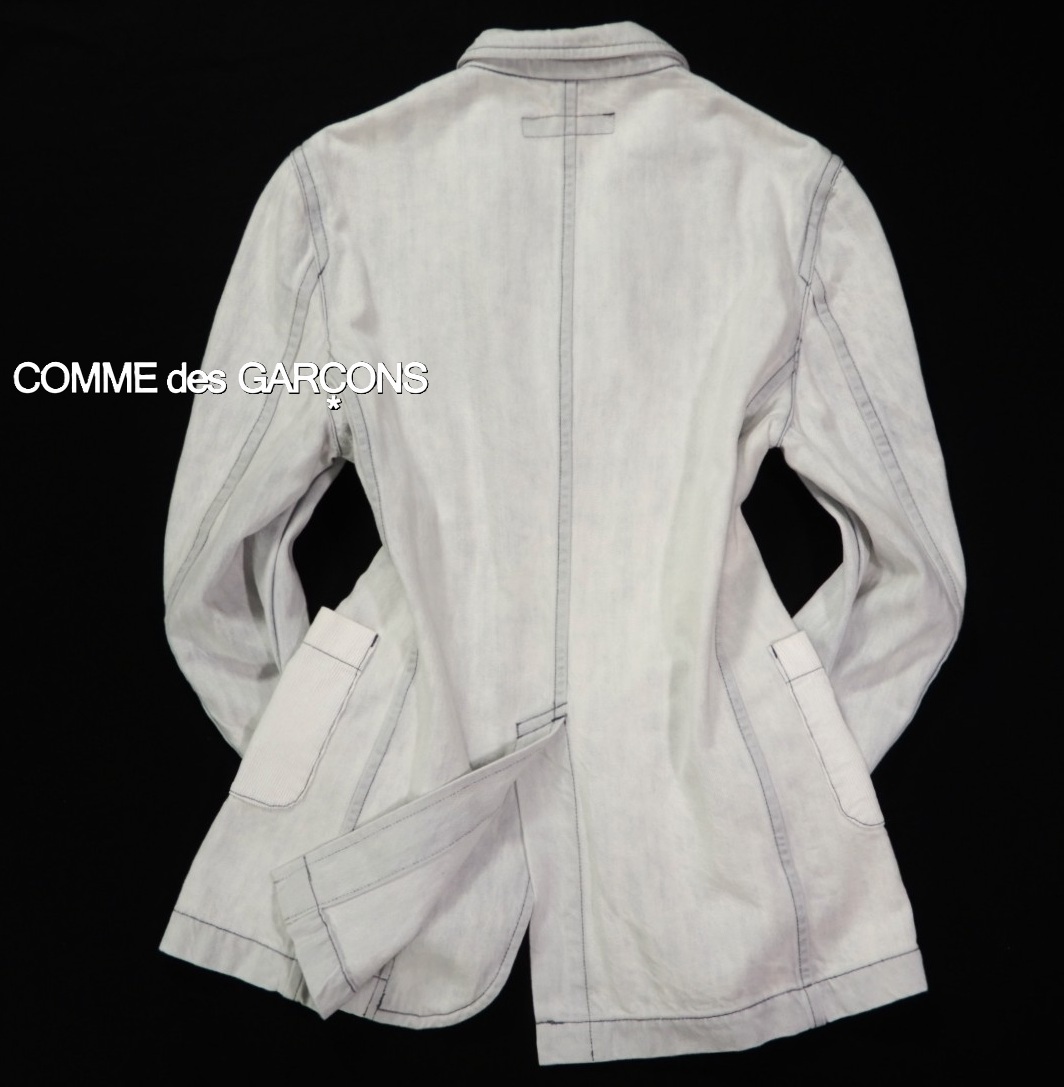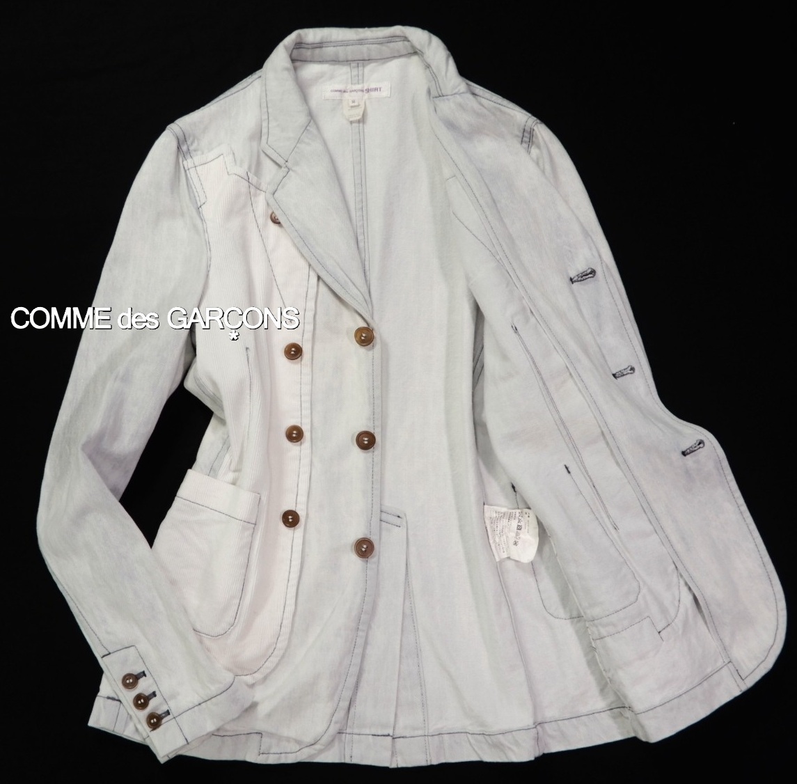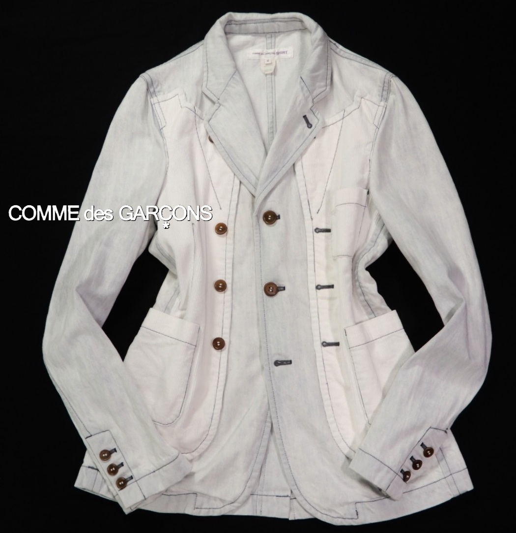 COMME des GARSCONS SHIRT ジャケット サイズ表記:M お色:ウォッシュドブルー、白 素材:綿100% 平置き実寸:肩幅40 身幅50 着丈72.5 袖丈67㎝位。 本切羽、3ボタン、センターベント。 |