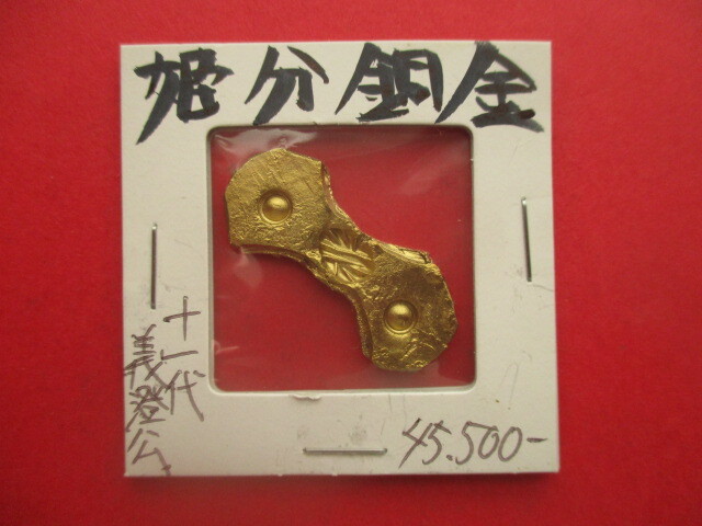 室町時代後期に鋳造され、後世の太閤分銅金の手本になったと伝えられています。臣下に嫁ぐ姫君に将軍から下賜されたことで、コレクターには姫分銅金と呼ばれています。表面の刻印によって鋳造時期が特定されるとのことです。