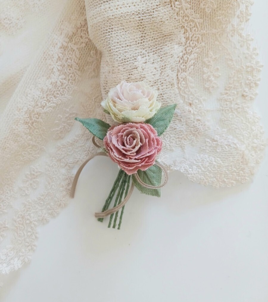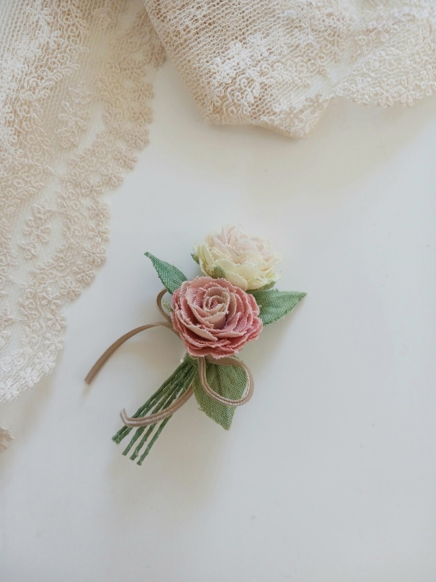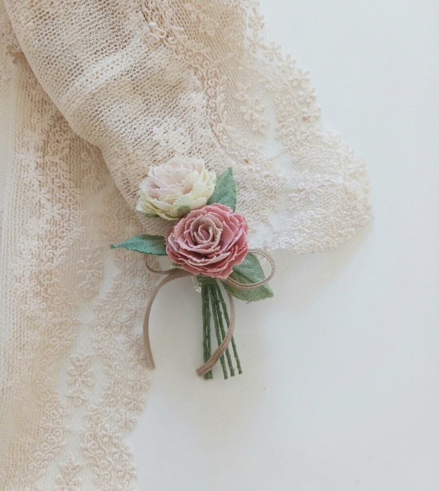 コサージュは、白い晒木綿に花びら、葉を形どり手染めしコテで創作致しました。
