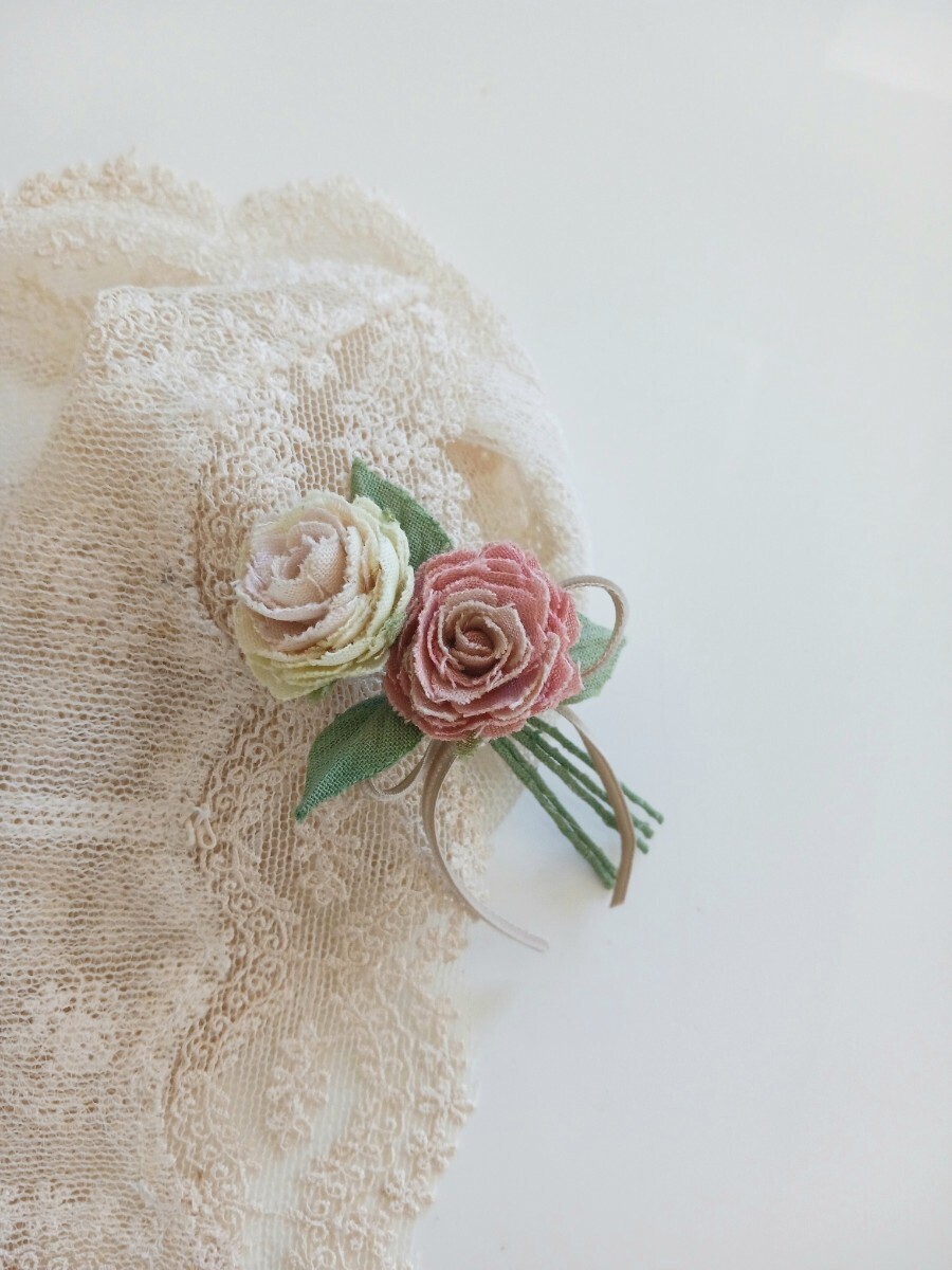 風情ある柔らかな晒木綿の薔薇2輪、葉3枚に、ベージュベルベットリボンを結び、可愛いコサージュに仕上げました。 リボンは、お取り外し可能です。