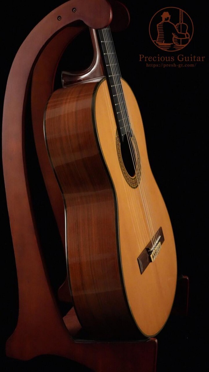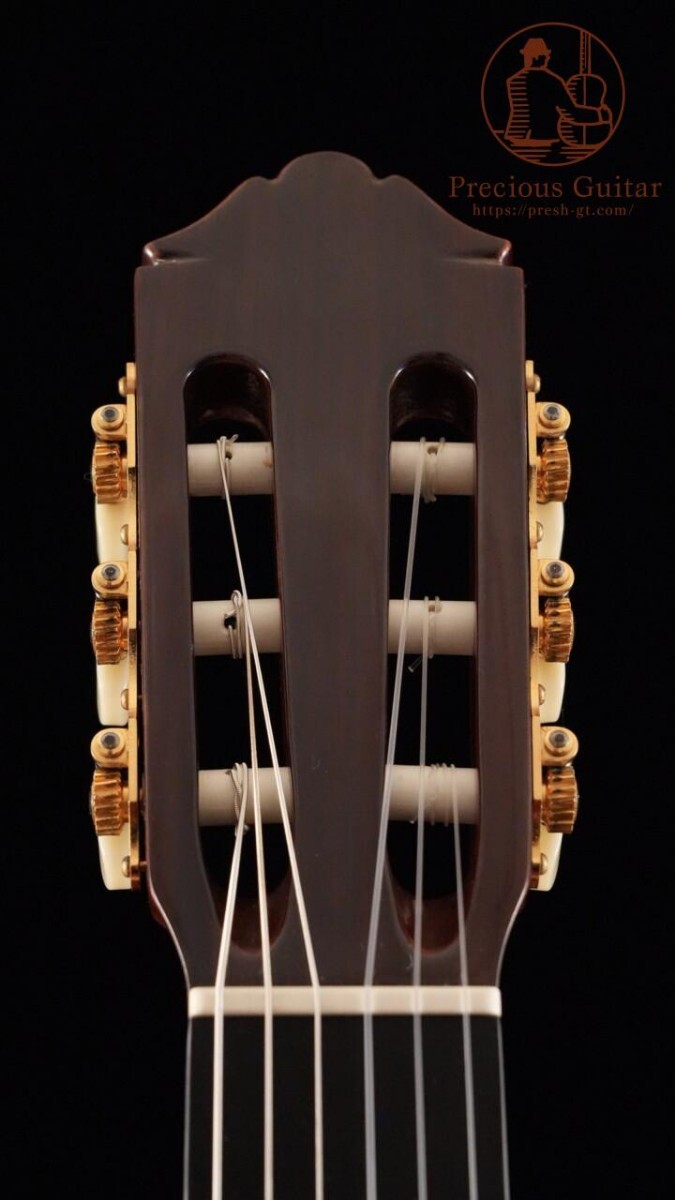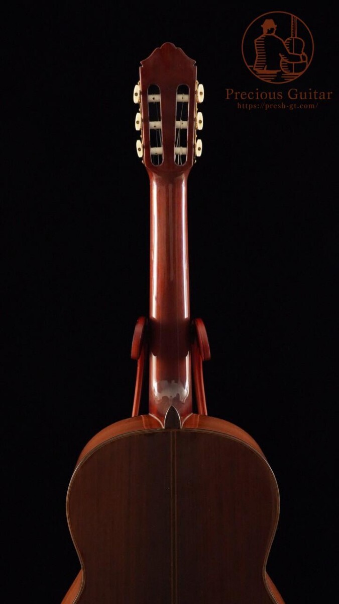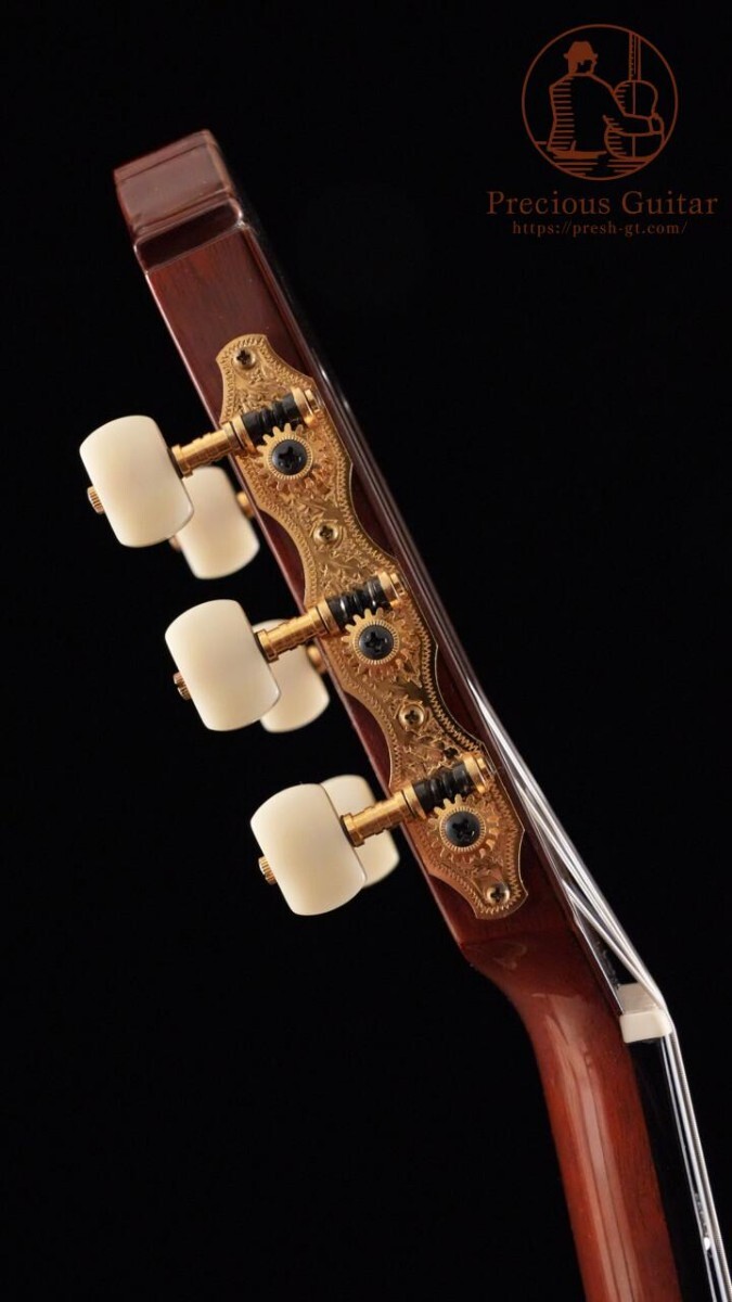 トップはスプルース単板、同価格帯の現在のトップ板から比べると年輪は緻密な個体です。ブリッジの剥がれはありません。塗装はウレタン塗装、僅かに打ち傷、弾き傷を認めますが、いずれも軽微であり年式を考慮すると綺麗な状況です。サイド並びにバックはローズウッド合板です。いずれもウレタンです。大きな傷はなく比較的綺麗な状況なものの、前述の白濁を認めます。指板の目立つ凹みはありません。フレットの減りは中古ですので8割残とします。音の詰まりはありません。ネックは捻れはなく極軽く順反、クラシックギターとしては最適な状況です。サドルの出代はまだ残っていますので、弦高はもう少し下げることができます。ペグはYAMAHAオリジナル、軸間35mm、スムーズに巻き上げます。