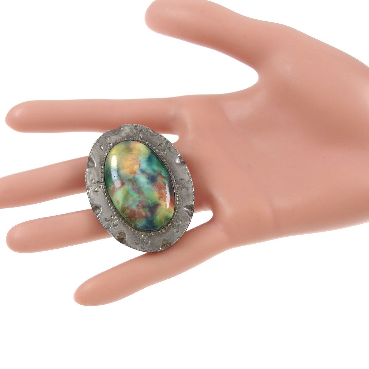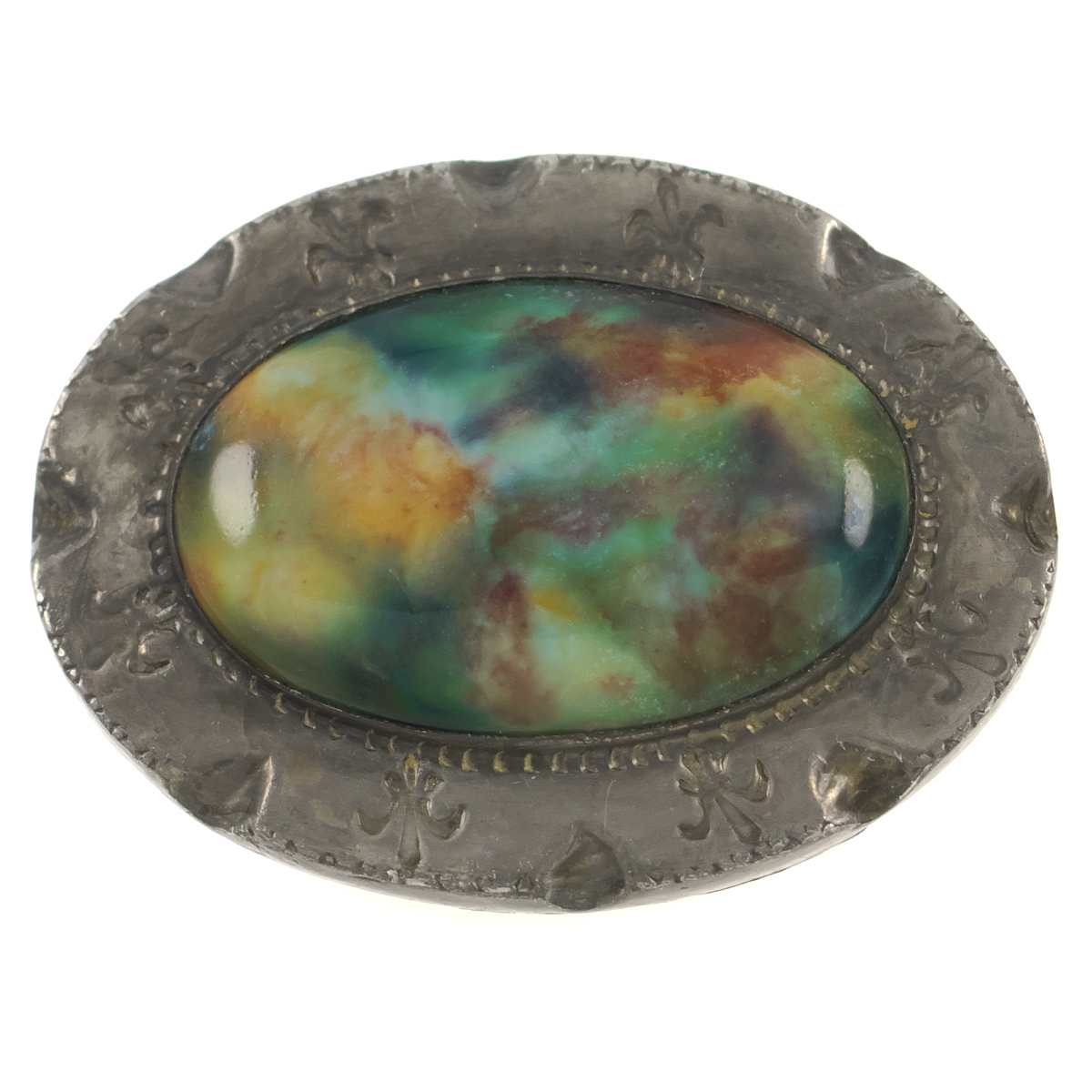 UK3752◆ オーバル 綺麗なマーブルカボション フルールドリスの模様 ユリ 花柄 フラワー ケルト 英国 イギリス ◆ ヴィンテージブローチ◆