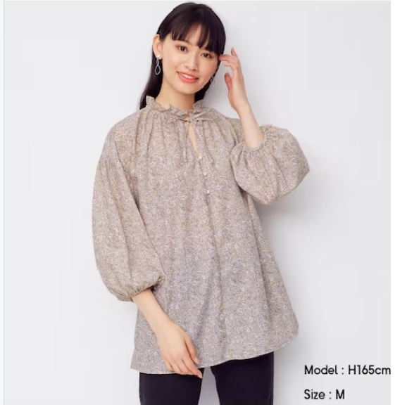 GU のプリントフリルネックペザントブラウス(7分袖)です。