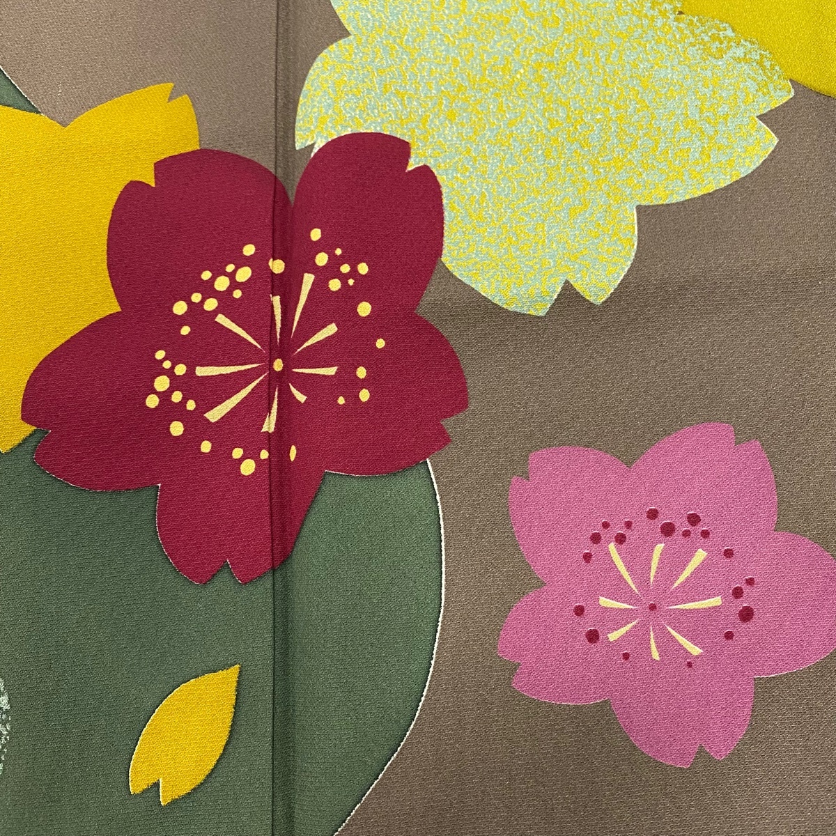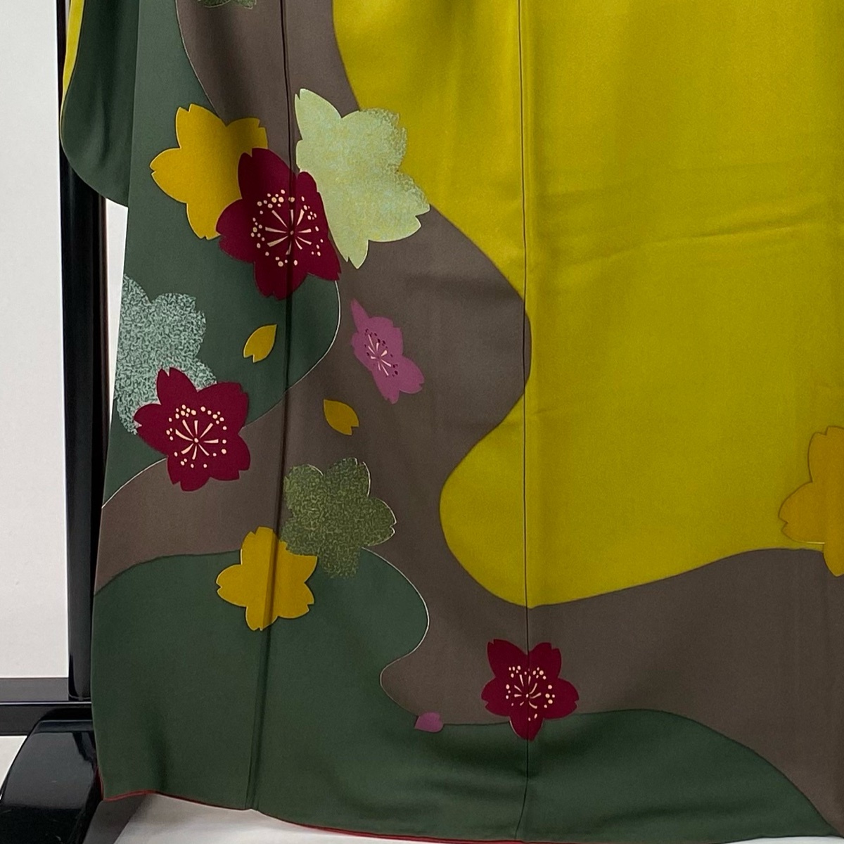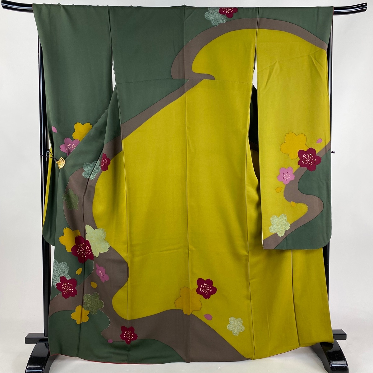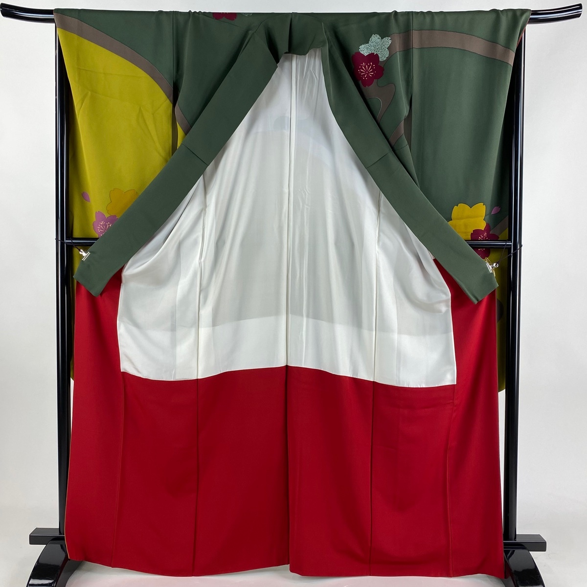 振袖 名品 桜 花びら 染め分け 深緑 袷 身丈166 裄丈69 L 正絹 【中古】 |