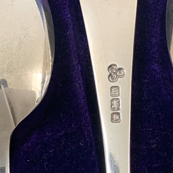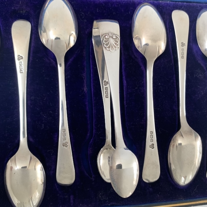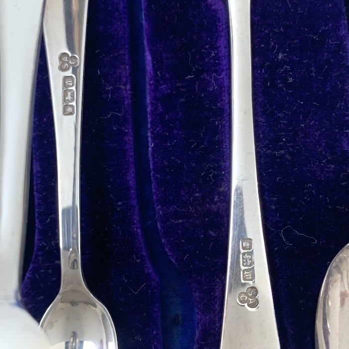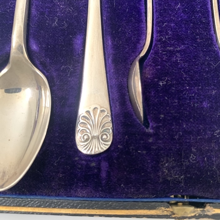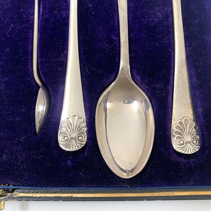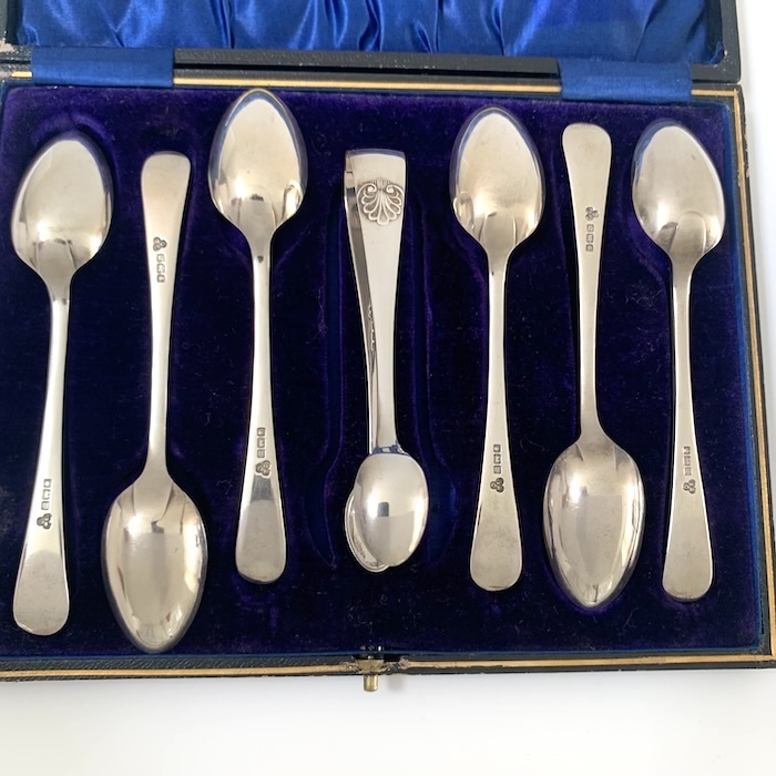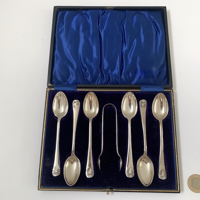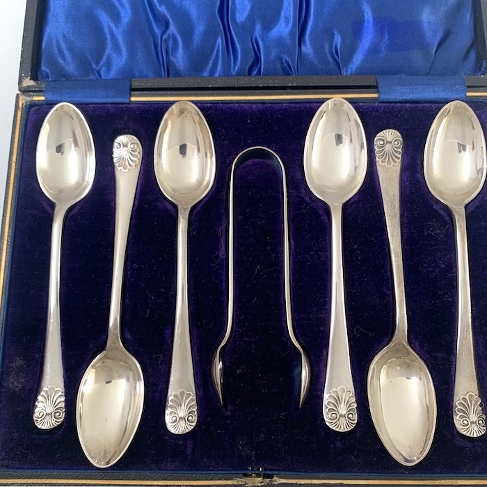 ロンドンにて購入のアンティークです。スプーン6本とトングのセットです。シルバー、シェフィールドSAC、1914年製です。