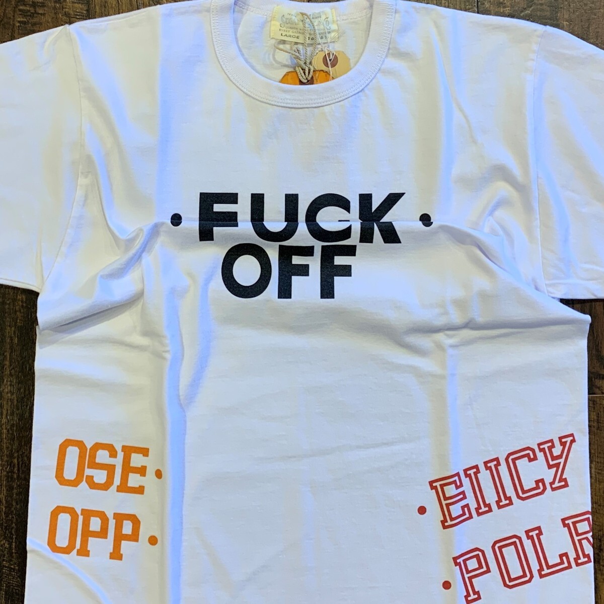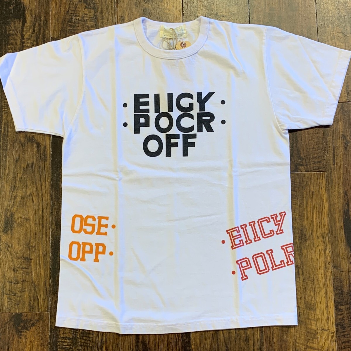 古着のギミックTシャツを集めてみると、書体や配色は異なれどプリントはフロント一箇所のみ。そのまま復刻するのは少々物足りないので、シュガーケーンではヴィンテージのテストプリントTシャツ(プリント工場で量産直前に色や版の最終確認用として試し刷りをしたTシャツ)を参考にして、選抜した4種類のプリントを前後と両脇に配置。1着のTシャツで4つの「ギミック」を楽しめるよう仕上げた。ボディはコットン100%の18番単糸で編み上げたチューブラ(丸胴)仕様のアメリカ製。