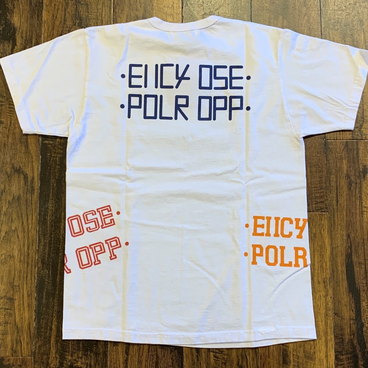通称「ギミックTシャツ」と呼ばれる古着のTシャツがベース。流行の始まりは不明だが、1970~80年代に多くのメーカーが異なる書体、配色でプリントし、様々なバリエーションが作られた。デザインは一見、意味のない文字らしきものの羅列に見えるが、プリントの両端にある上下のドット同士を合わせると文字になる、という実にアメリカらしいギミックが仕込まれている。