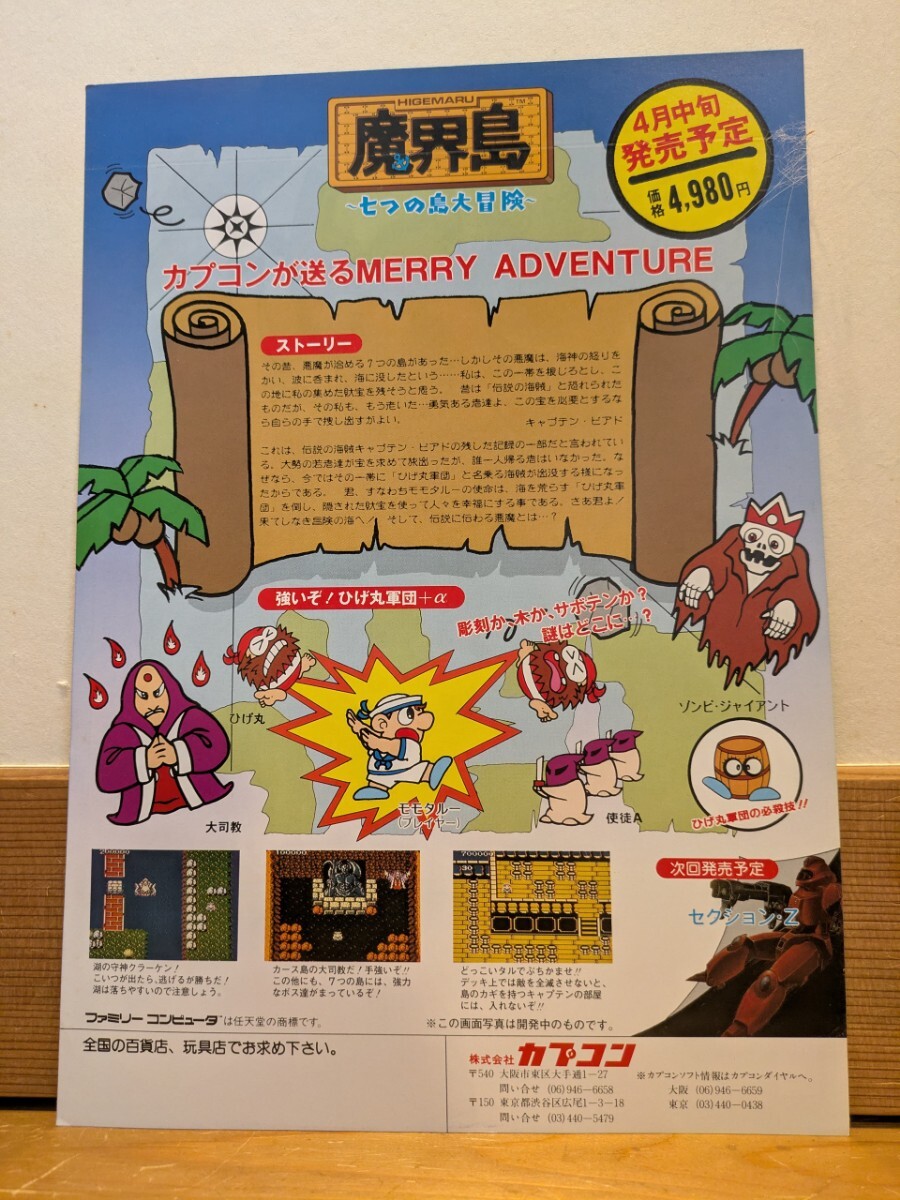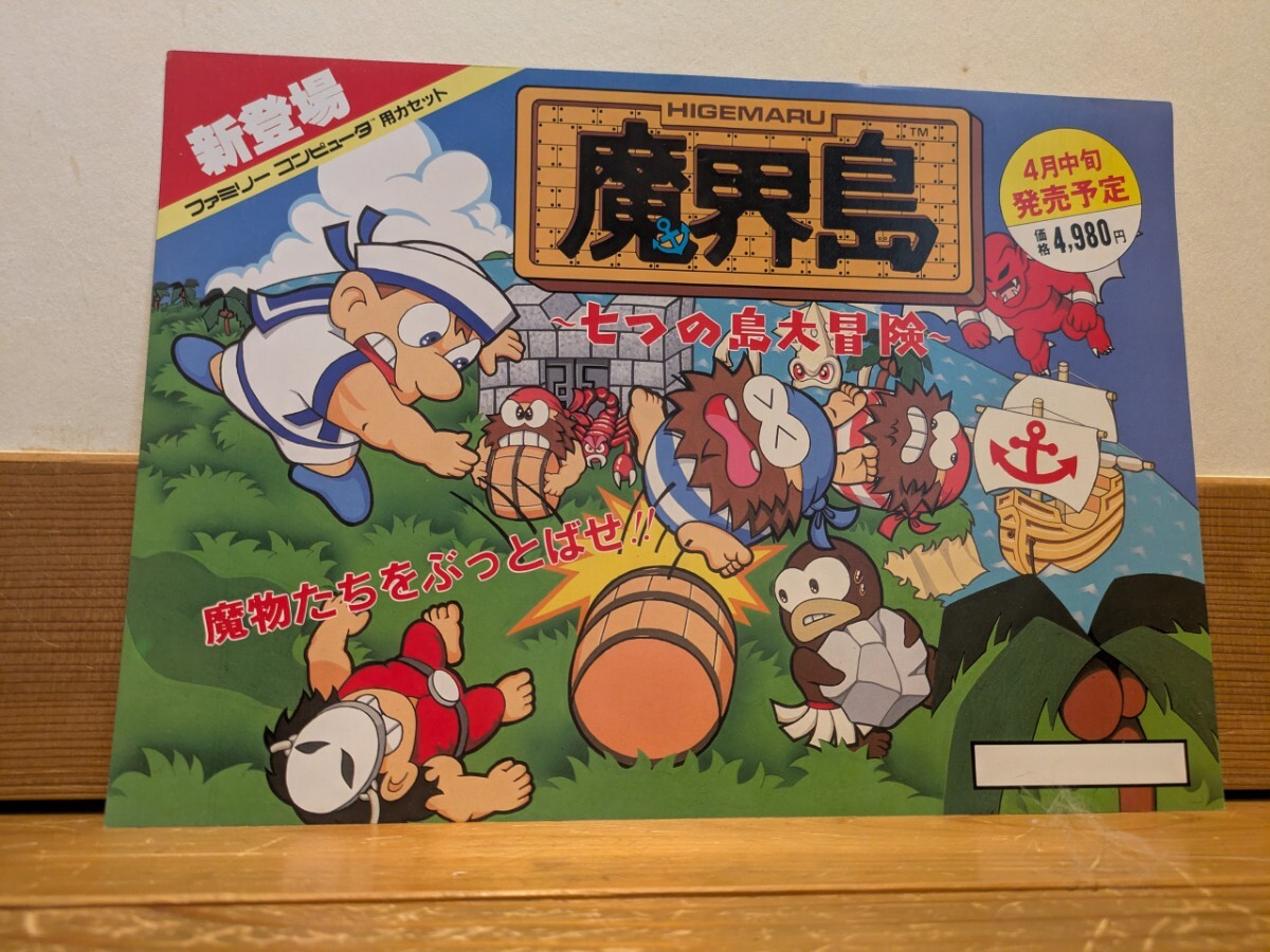 1987年、カプコン製。ファミリーコンピュータ専用ソフト『魔界島 七つの島大冒険』の販促用のチラシです。大きさはA4サイズ。状態は、ファイルに保管してあったもので、新品同様の美品です。
