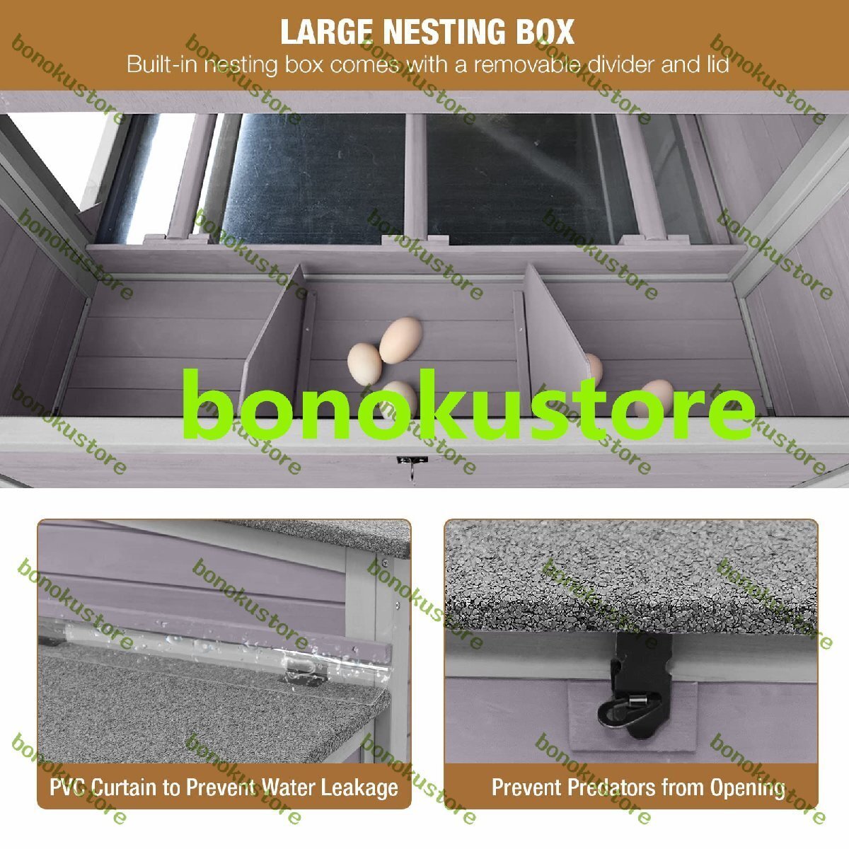 【3つの入れ子ボックス】ネスティングボックスの上のポリ塩化ビニル層が内部をドライに保ちます。ネスティングボックスは3つのパーツに分かれており、卵を産むための広々としたスペースを提供します。
