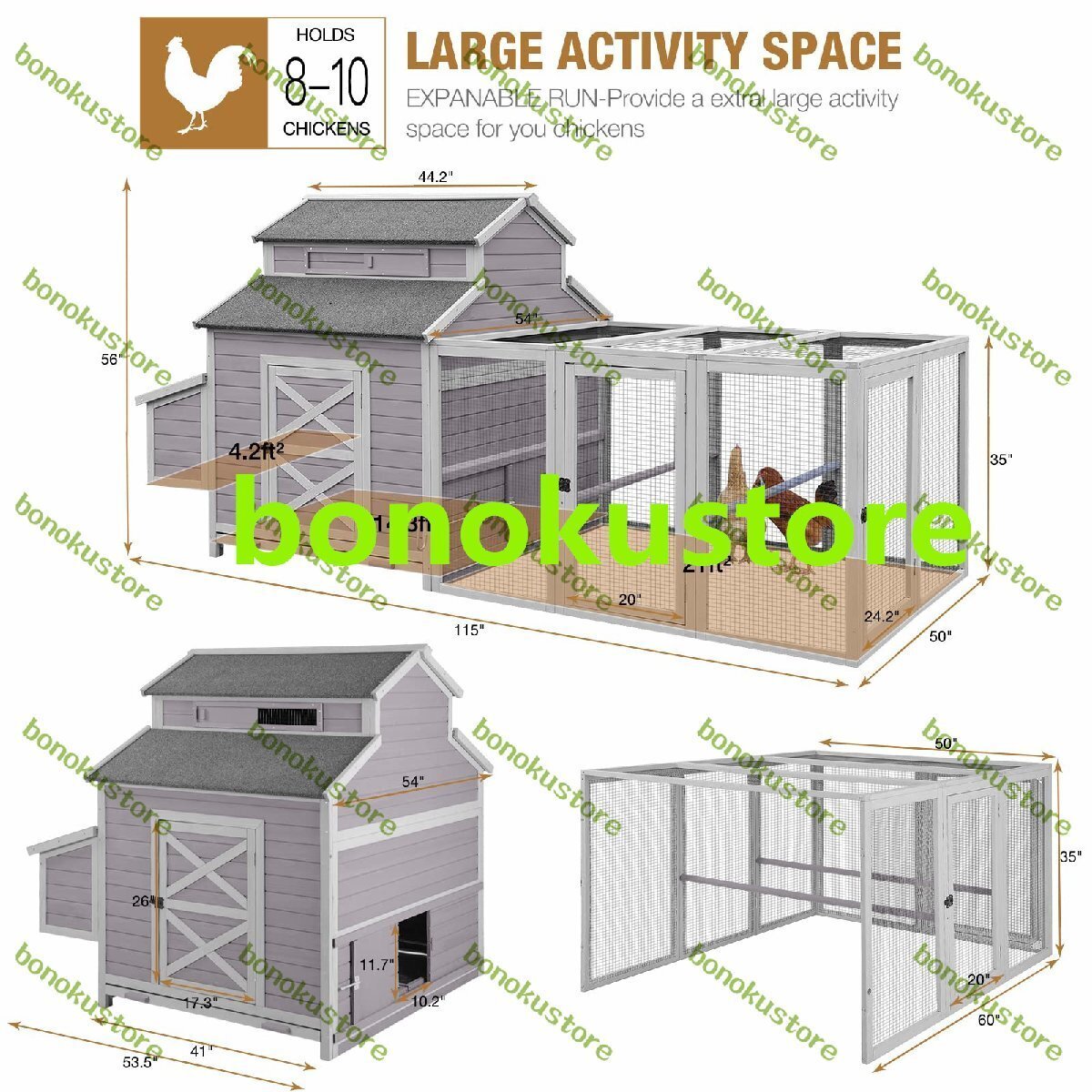 【広々としたスペース】大きなランのチキンハウスは、8~10匹のニワトリ、アヒル、ウズラに最適です。全体の寸法:115インチ(長さ) x 54インチ(幅) x 56インチ(高さ)。