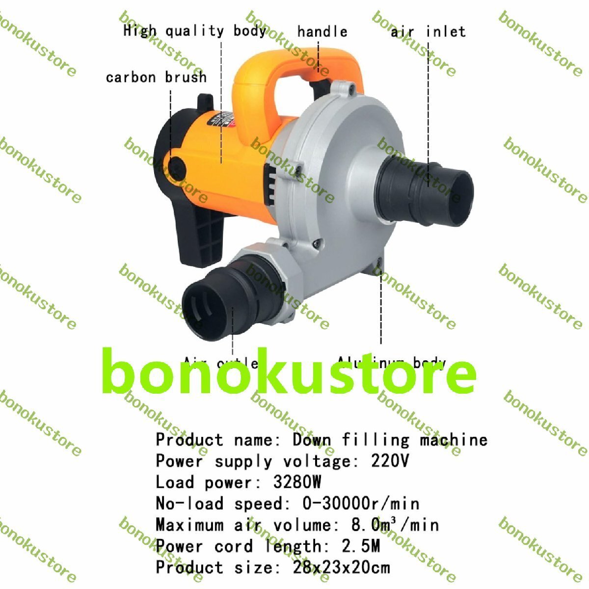製品名: ダウン充填機 電源電圧:220V 負荷電力: 3280W 無負荷速度: 0-30000r/min 最大風量:8.0m3/min 電源コードの長さ: 2.5M 製品サイズ: 28x23x20cm パック: 1xダウン充填機 3x 拡張丸チューブ 1x フットスイッチ 1x ダストバッグ 1x1Mホース 1x2Mホース