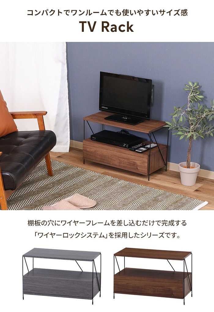 棚板の穴にワイヤーフレームを差し込むだけで完成する「ワイヤーロックシステム」を採用したテレビラック。 オープン収納部分にはAV機器やお気に入りの小物などをディスプレイできます。 内寸幅53×奥行23.5×高さ7.5cmの引き出しがついているので、DVDやリビング小物などを隠して収納できます。 オープンボードでAV機器などの熱もこもりにくく、配線にも困りません。 幅30×奥行36cmとコンパクトでワンルームでも使いやすいサイズ感です。 |