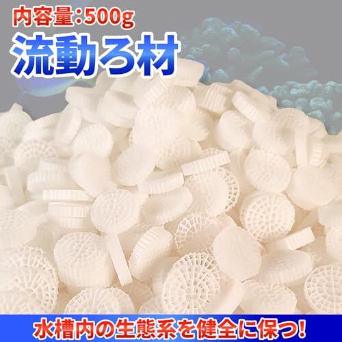 「流動ろ材 Φ25 多孔質濾過フィルター材料 水槽用品 ろ過材 生物濾過 バクテリア 床 微生物 MBBR 約25mm×5mm (500g)」▼4582625542326▼(商品説明)500g/-/42326_242・Color:500g・パッケージ個数:1・商品仕様 : サイズ:約25mm×5mm・不純物の除去 : 水槽内に魚の排泄物、餌の残り、その他の有機物が蓄積すると、水質が悪化し、有害なアンモニアや亜硝酸塩のレベルが上昇します。流動ろ材は、これらの不純物を物理的に捕捉し、取り除くことで水質をします。・水質の安定化 : ろ材を通過する過程で、有害な化学物質が中和または除去され、水のpH値や硬度が安定します。これにより水槽内の魚、バクテリア、藻類が健康に過ごせます。・良好なバクテリアを生成 : 水槽用ろ材は、良好なバクテリアが増えやすい環境を作ります。これらのバクテリアは魚にとって危険なアンモニアや亜硝酸塩といった物質を安全な亜硫酸塩に変えてくれます。・魅力的な水槽に : 水質だけでなく、清潔で透明な水は水槽をより魅力的な空間にします。流動ろ材は、水槽を美しく保つ上で重要な役割を果たします。商品の説明 商品仕様 : サイズ:約25mm×5mm 使用方法 水槽用ろ材は、良好なバクテリアが増えやすい環境を作ります