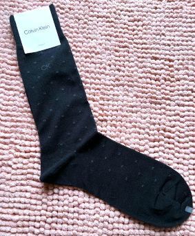 ●タグも付いたままの、未使用、新品のカルバンクラインの黒色地にドット柄・クルー丈メンズソックスです