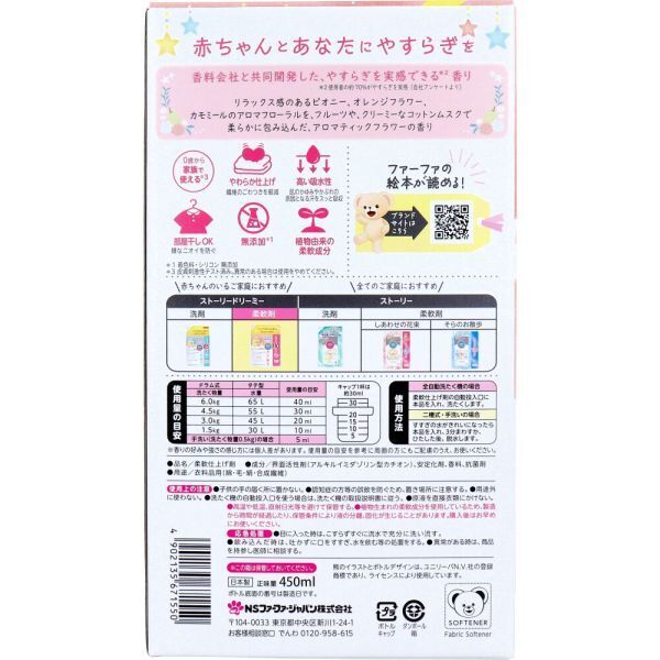 赤ちゃんとあなたにやすらぎを 香料会社と共同開発したやすらぎを実感できる香り ※NSファーファ・ジャパン社アンケートより使用者の約70%がやすらぎを実感 0歳から家族で使える ※皮膚刺激性テスト済み やわらか仕上げで繊維のごわつきを軽減 高い吸水性で肌のかゆみやかぶれの原因となる汗をスッと吸収 部屋干しOK 着色料とシリコン無添加 植物由来の柔軟成分 アロマティックフラワーの香り ファーファ型ボトル 【商品詳細】 個装サイズ:122mmX218mmX92mm 個装重量:約604g 内容量:450mL 用途:衣料品用(綿・毛・絹・合成繊維) 成分:界面活性剤(アルキルイミダゾリン型カチオン)、安定化剤、香料、抗菌剤 製造国:日本 発売元:NSファーファ・ジャパン株式会社 JANコード:4902135671550 |
