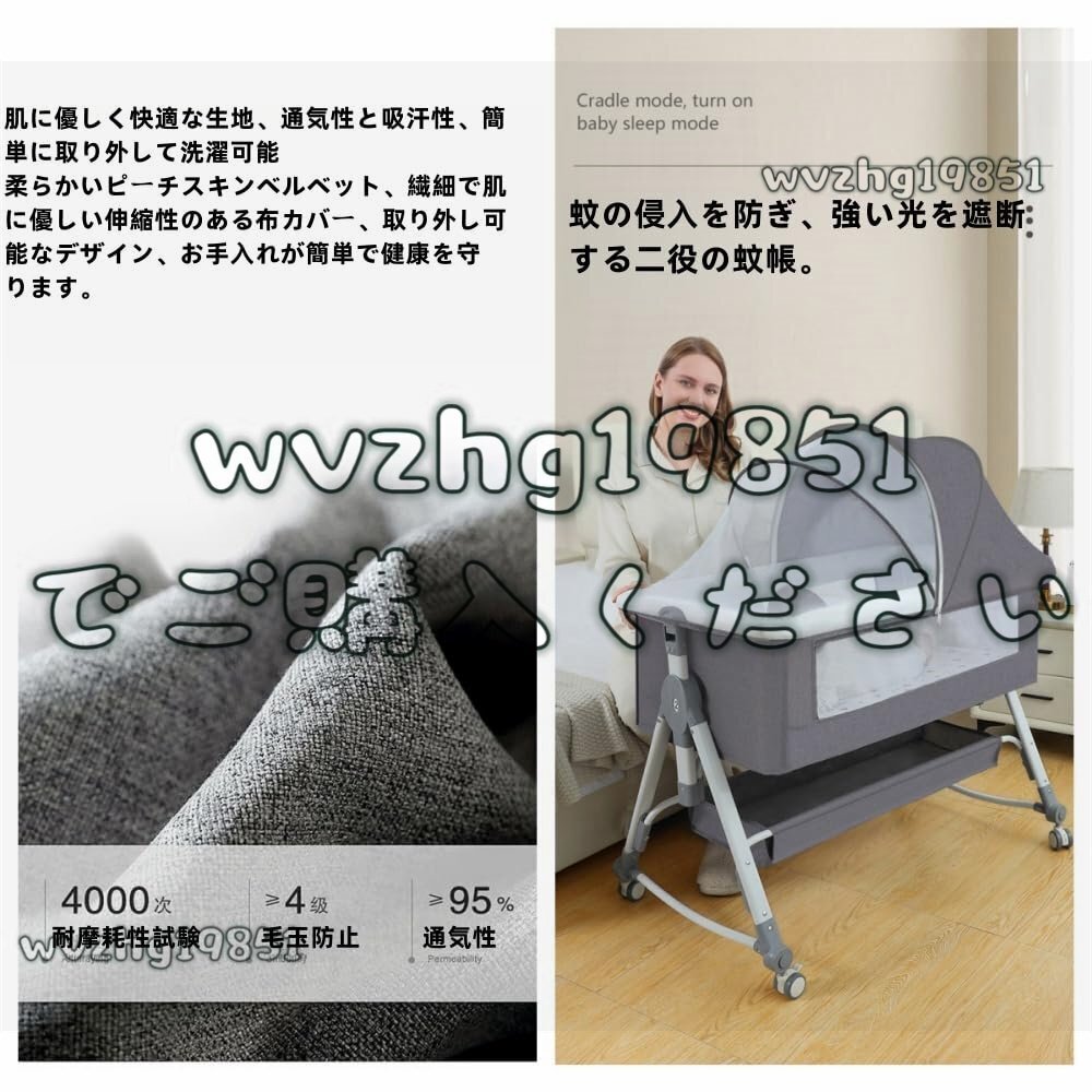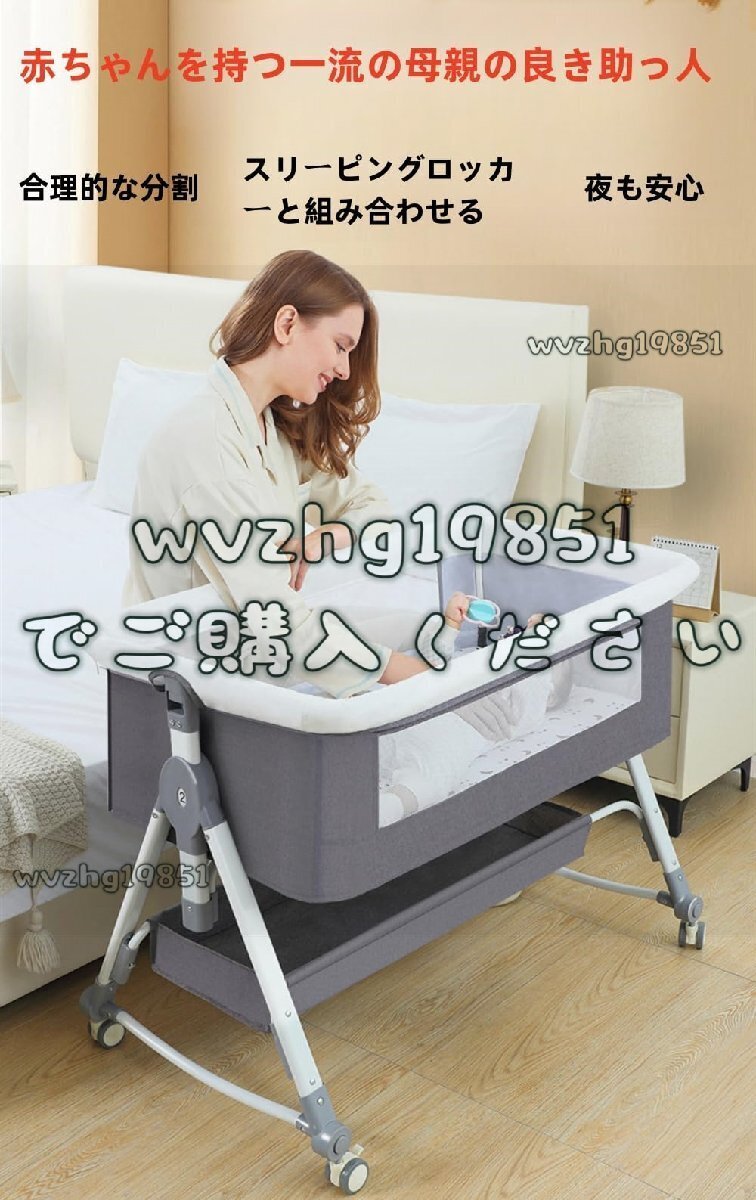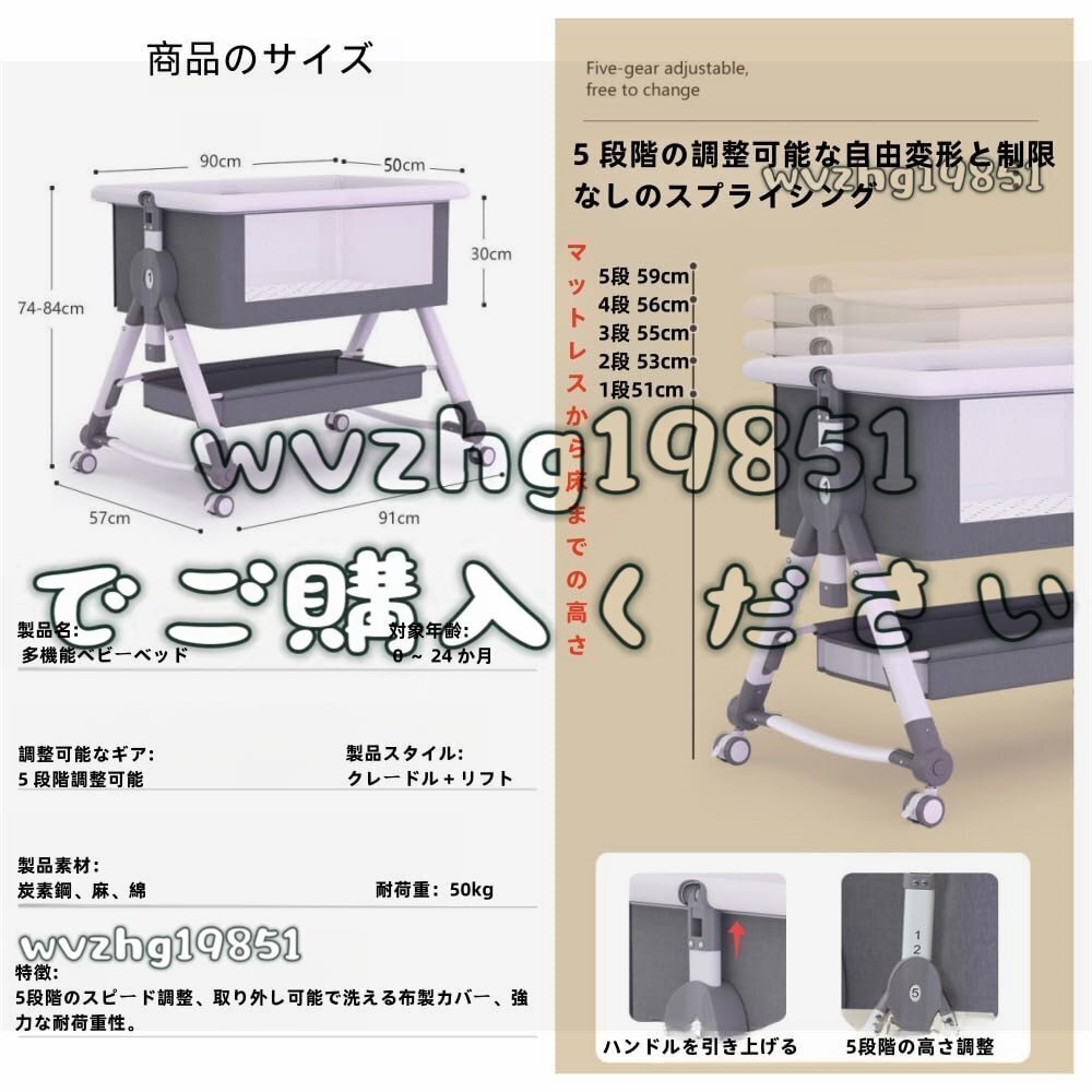 商品の説明 ベビーベッドはママの手を解放し、赤ちゃんの世話をしやすくし、リラックスして休む時間を増やすことができます。 ベビーベッドはお子さまの肌に直接触れるものなので、素材選びはとても重要です。 赤ちゃんの肌はとても柔らかく、繊細で敏感なので、刺激性のある素材を使用すると、赤ちゃんの肌が炎症を起こし、反応してしまいます。 肌に優しい素材を使用しているので、デリケートな赤ちゃんの肌を刺激せず、快適に眠ることができます。 赤ちゃんはより快適でぐっすり眠ることができます。 おすすめポイント 多機能 5段階高さ調整 軽量・コンパクトで場所を取らない 充実したアフターサービス。 肌触りが柔らかく通気性に優れ、蚊や虫を寄せ付けません。 やわらかマットレスで赤ちゃんのお肌をやさしく守ります。 静音タイヤ 4本とも静音タイヤで、静かで安定感があります。 後輪のブレーキによりベッドが安定します。 吐き戻し防止新生児のミルクの吐き戻しを防ぐため、ベッドを少し傾けることができます(2段階の高低差を推奨)。 赤ちゃんの世話をしっかりしてください 赤ちゃんの肌に優しい素材を使用しています。 優れた体圧分散機能で、未発達の身体を適度な硬さで支えます。 通気性に優れています。 取り外し可能なカバー。 カバーは丸ごと取り外し可能なので、ご家庭で洗濯でき清潔に保てます。 赤ちゃんを細菌から守ります。 取り付けが簡単です。 安全ストラップでベッドに取り付け、4つのキャスターのブレーキをロックします。 わずか2ステップで簡単接続。 大人用ベッドに任意の高さで取り付け可能です。 変身クレイドル 女性でも簡単に取り付けられます。 片手で赤ちゃんを優しく揺すり、赤ちゃんを落ち着かせて眠りを誘います。 商品は厳重に検品しておりますが、稀に見落としがある場合がございます。 この場合は、メールでご連絡ください、24時間以内に迅速に対応させていただきますので、ご安心ください。