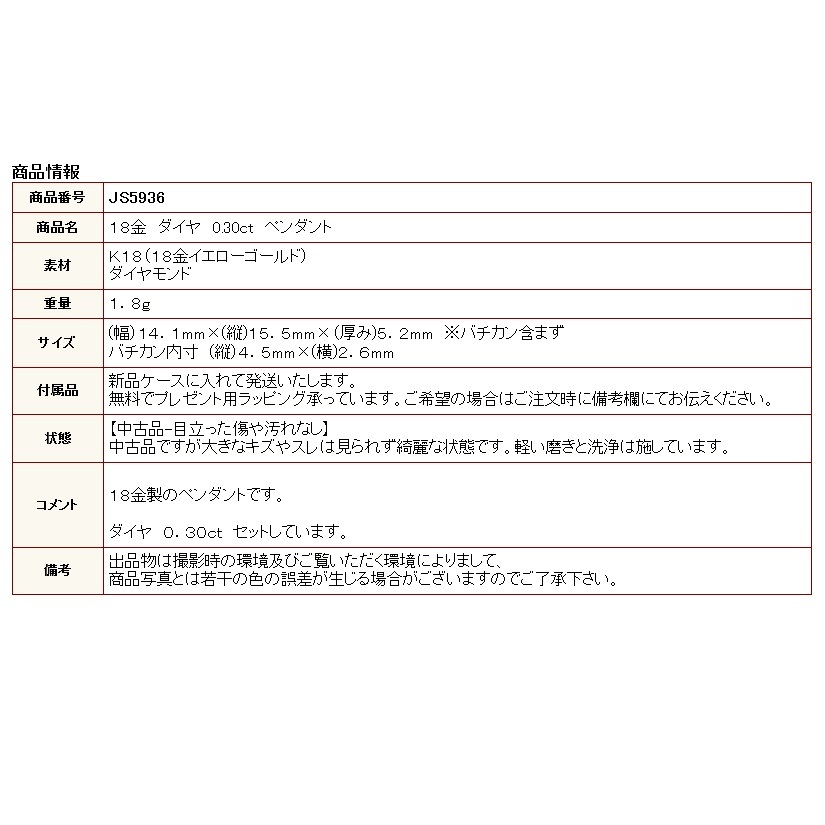 | 商品名 | 18金 ダイヤ 0.30ct ペンダント |