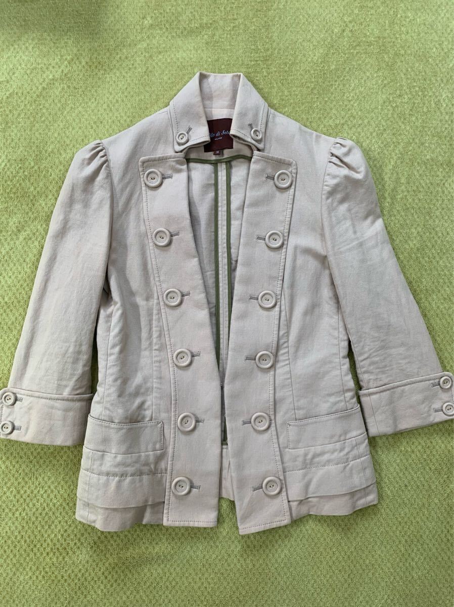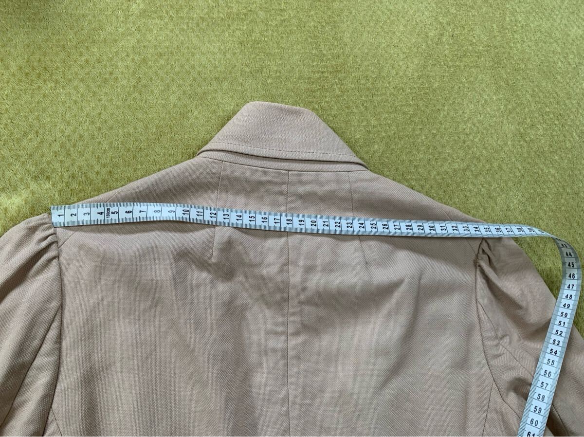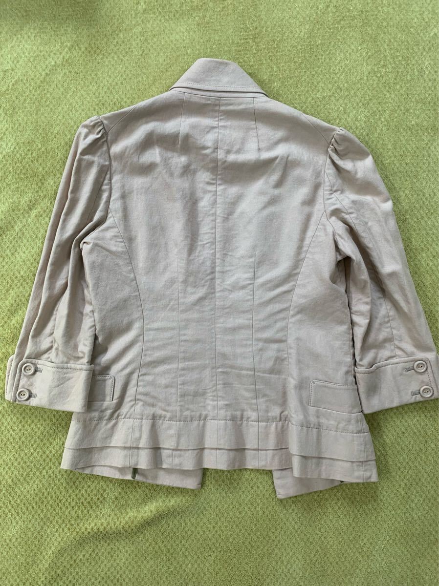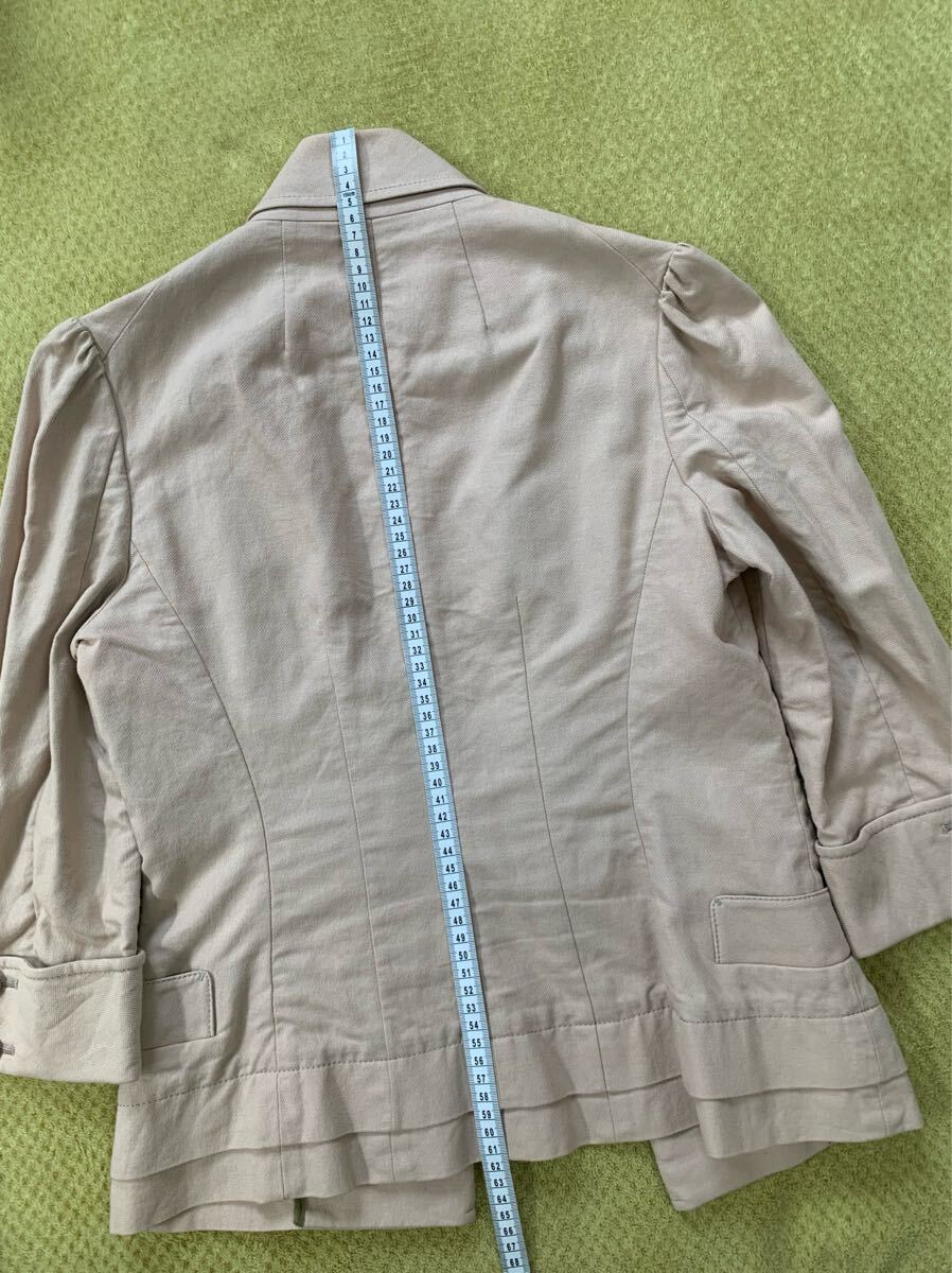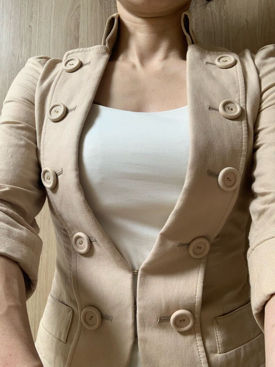 ボタンがアクセントのライトベージュジャケット、シンプルでスタイリッシュなデザイン。スタイル良くスマートに見えます。