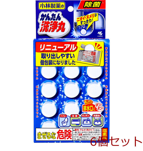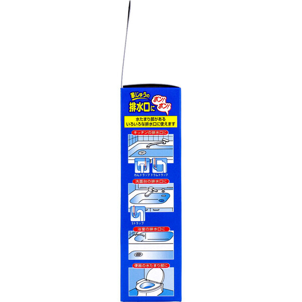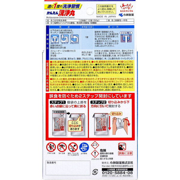 家中の排水口に!ポン!ポン! ニオイ・ヌメリがすっきり! ・キッチンの排水口に ・お風呂の排水口に ・洗面台の排水口に ・便器の水たまり部に ・まな板・食器のつけおきに 個装サイズ:100X218X12mm 個装重量:約85g 内容量:12錠入 製造国:日本 【発売元:小林製薬株式会社】 【用途】 台所・風呂・洗面所の排水口、便器の水たまり部等 (銅、真ちゅう、鋳鉄、アルミニウム、軟質塩ビ、木、ゴム製のものには適しません) 【液性】 弱酸性~中性 【成分】 塩素化イソシアヌル酸塩、発泡剤(炭酸塩・有機酸) 【正味量】 5.5g×12錠 【使用量の目安】 台所・浴室・洗面所の排水口・便器の水たまり部・・・1錠 ストレーナー・三角コーナー・まな板・・・約2Lの水に対して1錠 【使用方法】 ・台所・浴室・洗面所の排水口、便器の水たまり部に錠剤を1錠投げ入れてください。 ・ストレーナーや三角コーナー、まな板には容器に約2Lの水に対して1錠入れ、つけ置きしてください。 ・洗濯機には水をはった状態で約10Lに対し1錠の割合で錠剤を入れてください。 ・洗面台など錠剤が入りにくい小さな排水口の場合は、水で溶かして流しこんでください。 ・いずれの場合も30分程度放置した後、水で充分すすいでください。 ・家庭用浄化槽を傷めません。 【開封手順】 (子供の誤食を防ぐため、少し開けにくくなっています。) (1)ミシン目にそって1錠ずつハサミで切り取る。 (2)カドの「あけくち」から裏の紙をはがす。 (2タイプの開け口があります) (紙の一部は残る場合があります。) (3)錠剤を指で強く押し出す。 【使用上の注意】 ・製品は食べられません。 ・子供の手が届くところに置かない。 ・体調のすぐれない方は使用しない。 ・熱湯では使用しない。 ・用途以外に使用しない。 ・必ず換気をしながら使用する。 ・使用時はゴム製の手袋を使用する。 ・開封後はすぐに使用する。 ・直射日光、湿気をさけ、高温のところや製品がぬれるところには置かない。 ・汚れの種類や程度によっては、効果が期待できない場合がある。 <まぜるな危険(塩素系)> ・酸性・アルカリ性タイプの製品といっしょに使う(まぜる)と有害な塩素ガスが出て危険。 ・液が目に入ったらすぐ水で洗う。 ・子供の手にふれないようにする。 ・必ず換気をよくして使用する。 注意事項 予告なく成分・パッケージが変更になることがございます。 予めご了承ください。 *予告なく成分・パッケージが変更になることがございます。予めご了承ください *ダンボールを使用して発送する場合には、入数以下の個数の場合、 中古ダンボールを使用する場合があり、ご注文の商品とは異なるダンボールになる場合があります。 あらかじめ、ご了承ください。 |