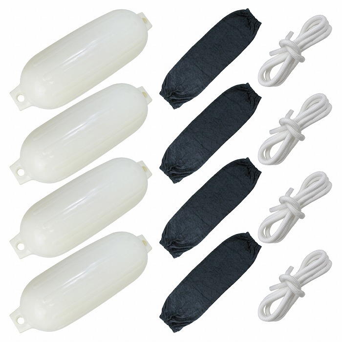 【送料無料】『3種×4セット』ボートフェンダー 580×190mm&黒カバー&ロープ 白 2m 船 浮き ブイ フロート 係留ロープ