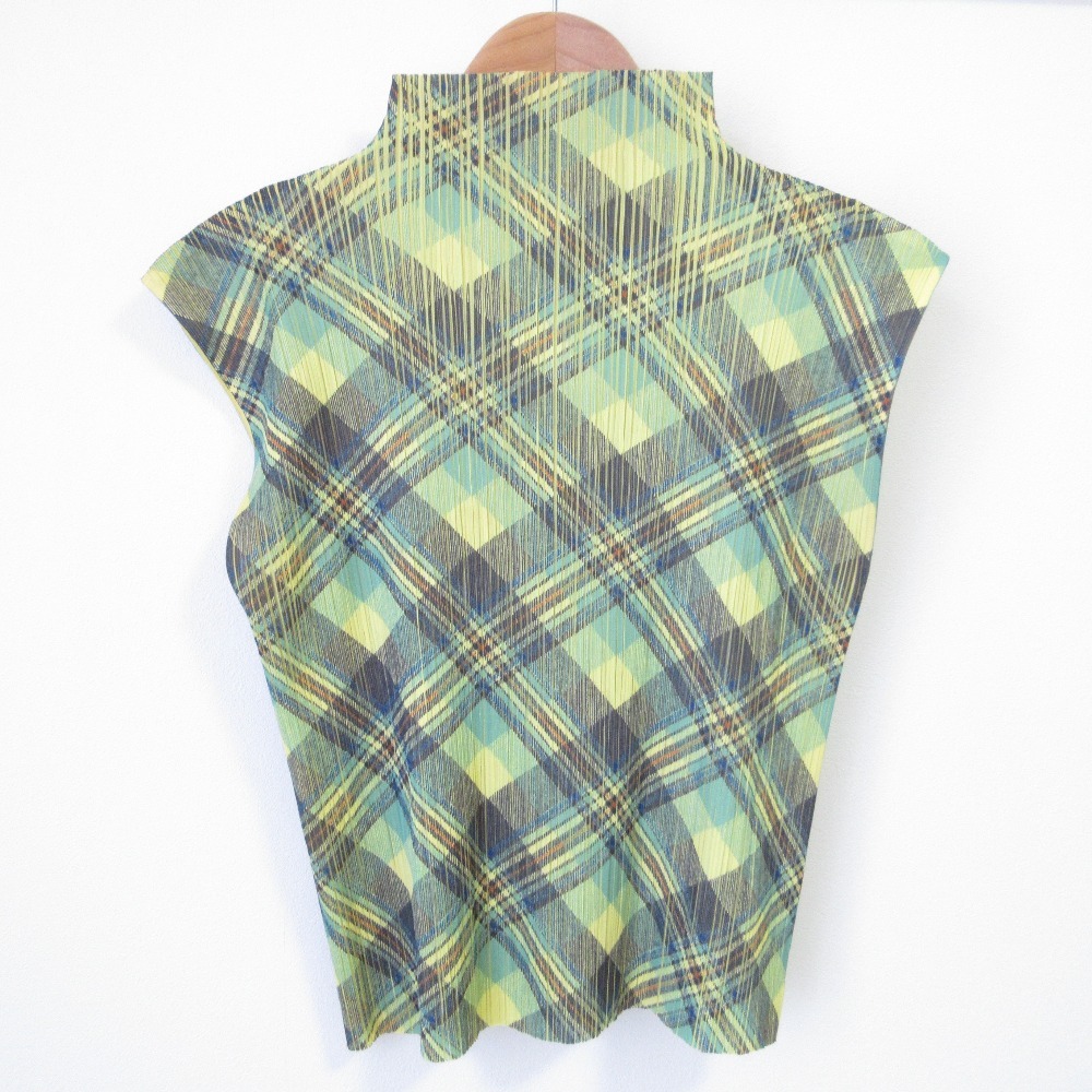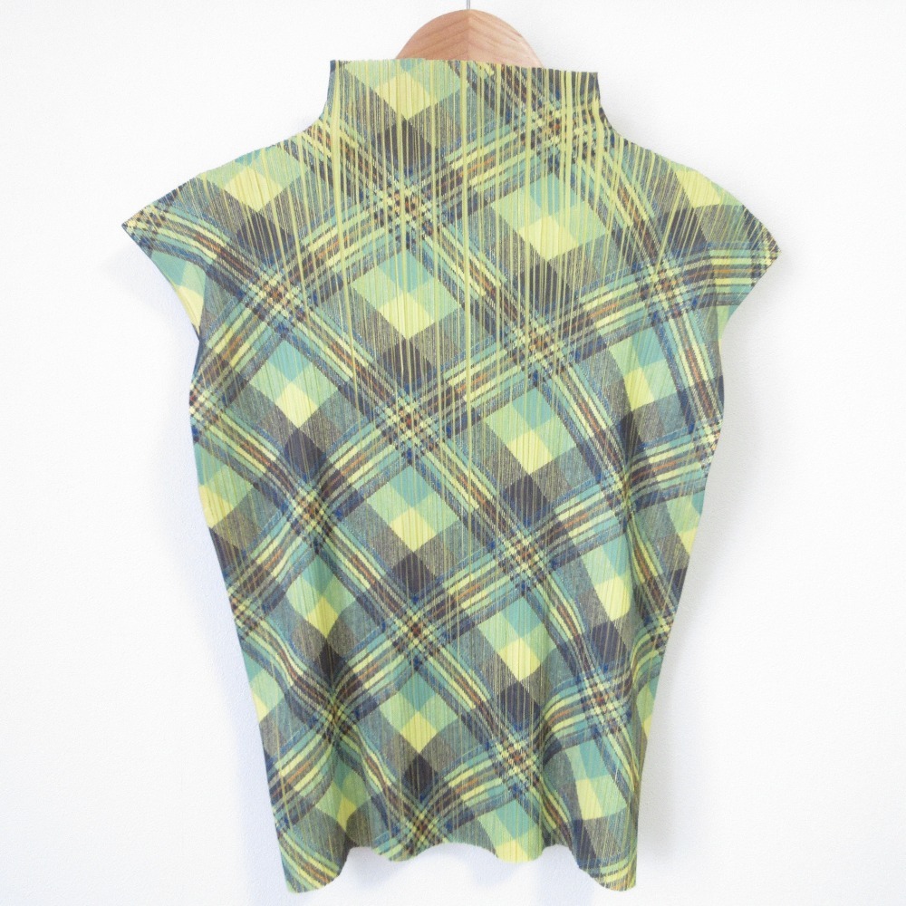 美品 PLEATS PLEASE プリーツプリーズ イッセイミヤケ チェック柄 ハイネック ノースリーブカットソー PP52-JK603 3サイズ グリーン