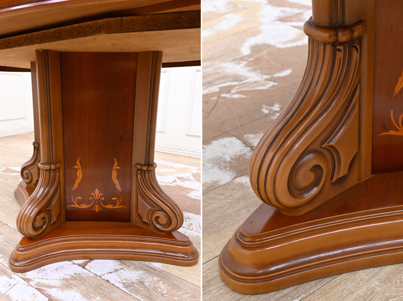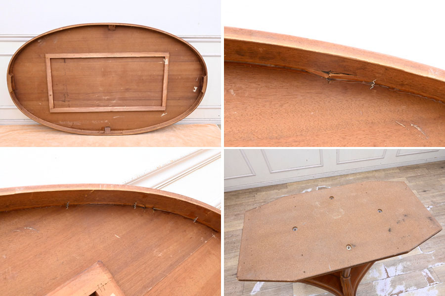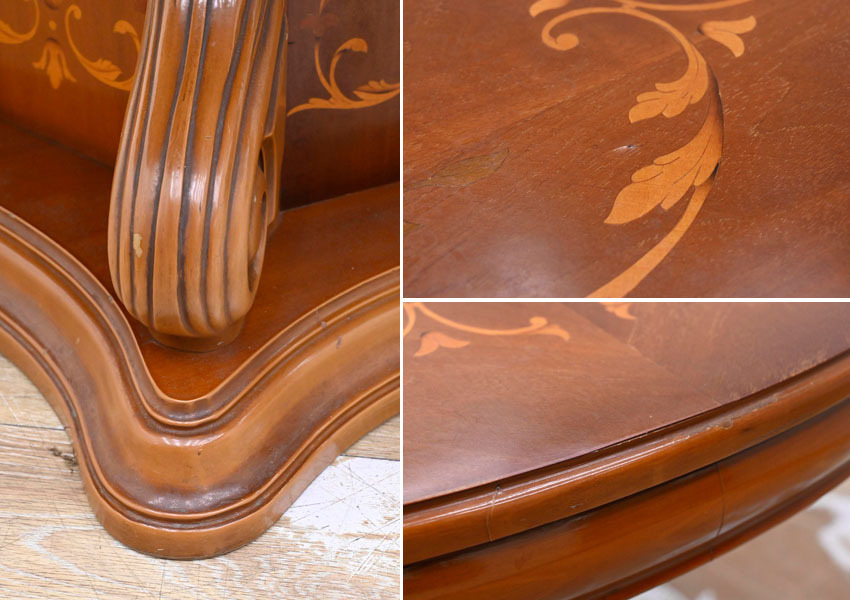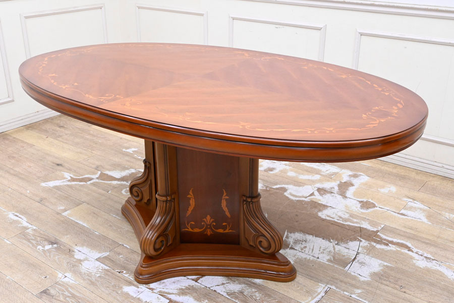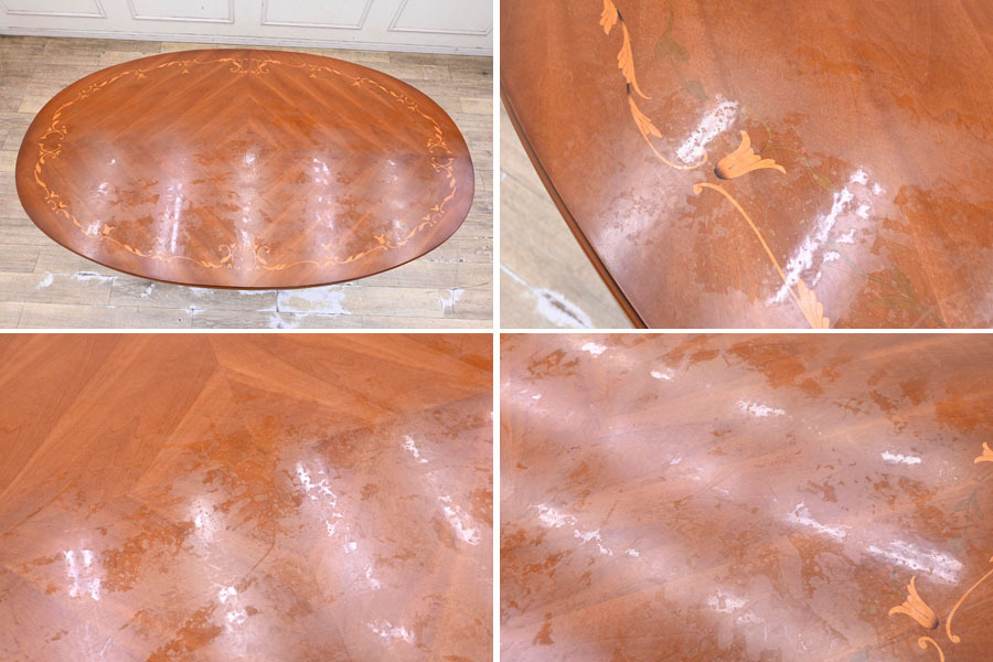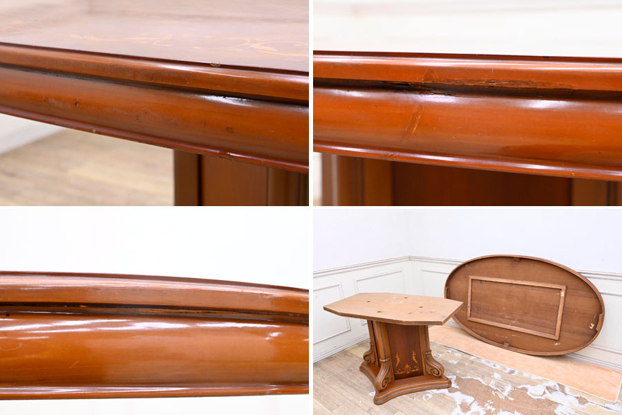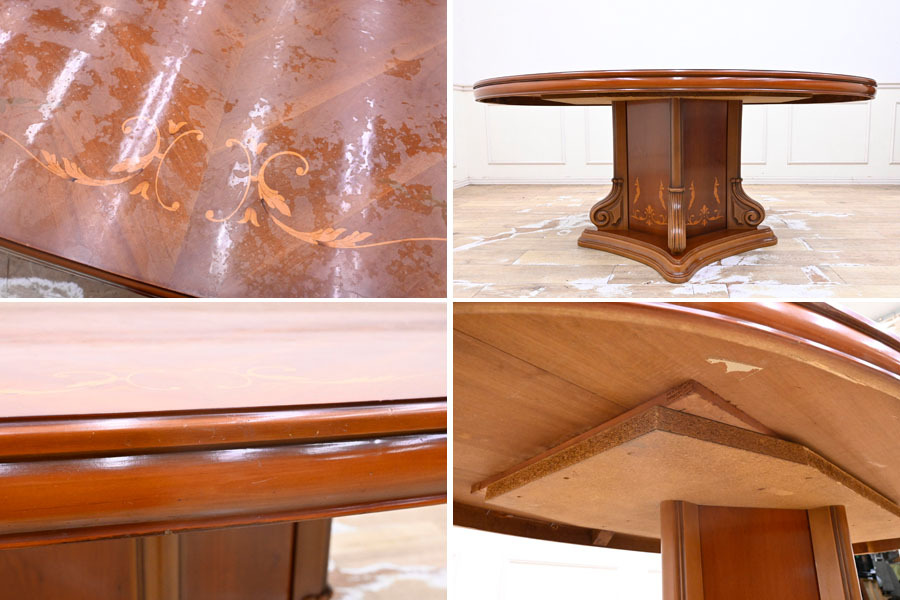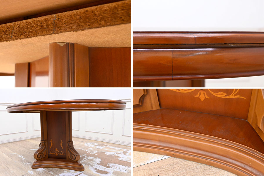 ----------------------------------------------------------------------------------------- ●送料や注意事項は必ずご確認下さい。落札後にトラブルになるケースが増えております。● ◆コンディションは写真・文章にて記載して有りますが、全てのキズの写真は掲載致しておりません。大きなダメージを除き見落とし、記載漏れが有る事はご了承下さい。 ◆当サイトにて出品する商品は多種多彩で、当方商品知識の無い物も多数ありますので落札後の質問やメンテナンス等にはお答えできません。 ◆入札された時点で、画像、文章をご理解していただいたものと判断させていただきます。不明な点は前もってQ&Aからお願い致します。入札後の質問やお電話等でのキャンセルは一切受け付け致しません。 ◆商品説明に「ノークレーム」と記載しているものに関しては、如何なる状況で届いても保証致しません。詳しくは注意事項の「商品到着後について」の最後に記載しておりますのでご確認下さい。 ---------------------------------------------------------------------------------------- イタリア製のダイニングテーブル、中古品の出品です。 天板はのっているだけです。片方に重心をかけすぎると倒れますのでご注意下さい。 天板にキズ、ヒビ、シート跡、クスミ、天板フレームに割れ、ガリ、スレ、浮き補修、脚にガリ、表面ハガレ、汚れ等ダメージあります。 サイズ 幅184×107.5 高79㎝ | ||