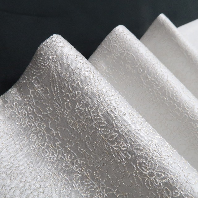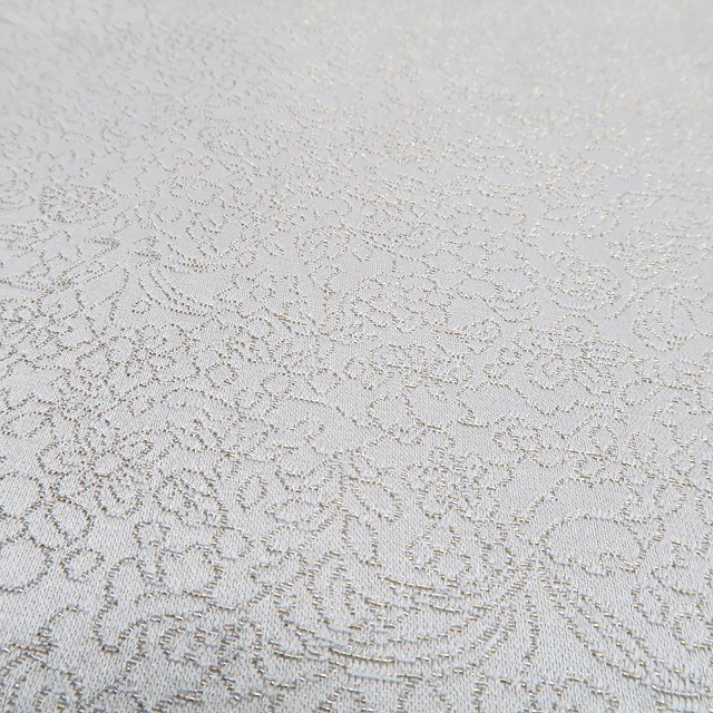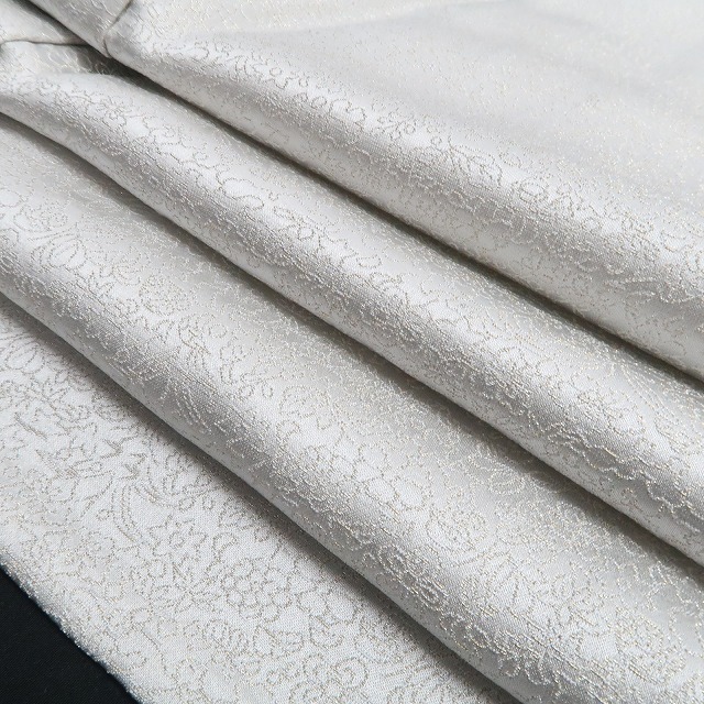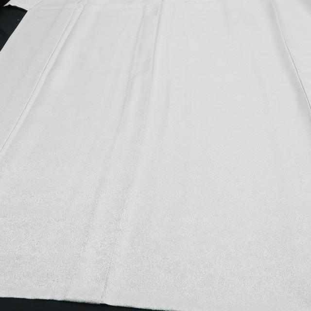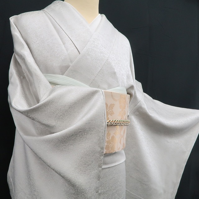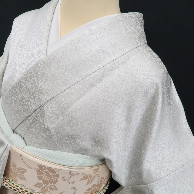生地は白練色の正絹地。しっとりとした風合いと柔らかな光沢感が調和し、上質な気品を醸し出します。織りによる模様が光の角度によってさりげなく浮かび上がり、シンプルながらも奥深い華やかさを感じさせるお着物です。