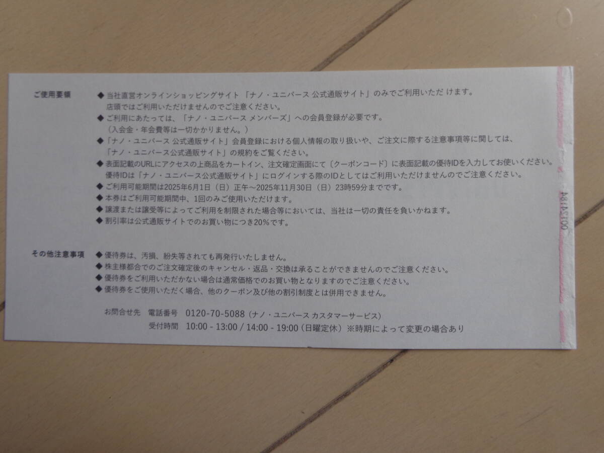 ナノユニバース ○20%OFF券 1枚○ 2025年11月30日まで TSIホールディングス 株主優待券 NANO Universe