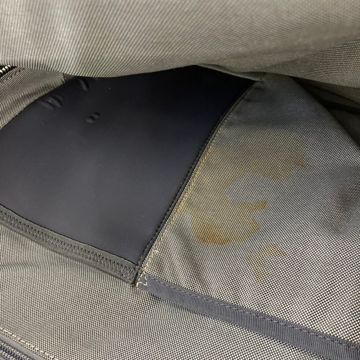 フロントポケット部分に2cm程のスレ、中央のジップに裂け、バッグ内側に濃く大きなシミや小さなシミが点々とございます。