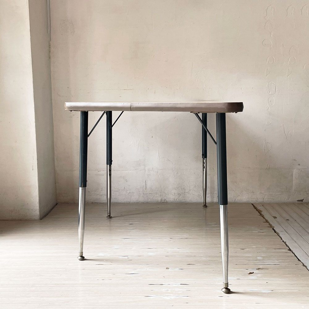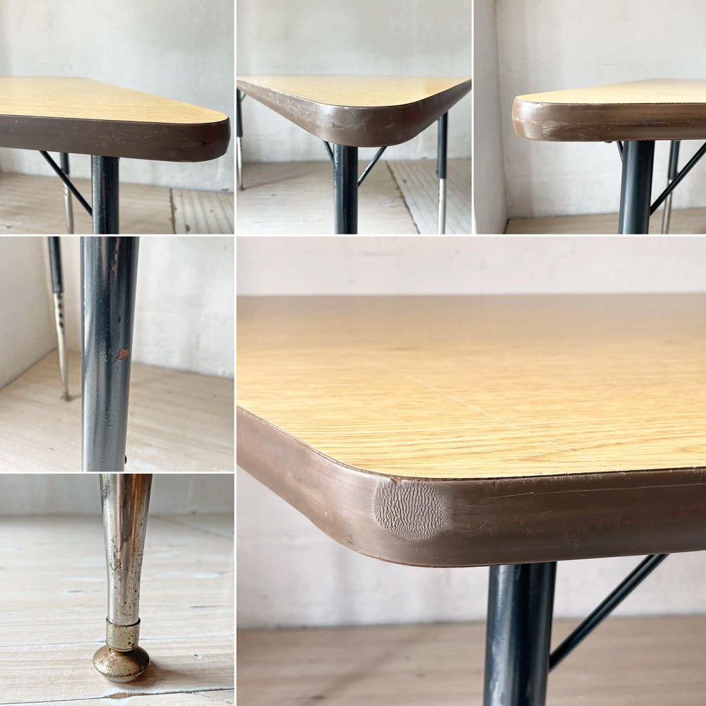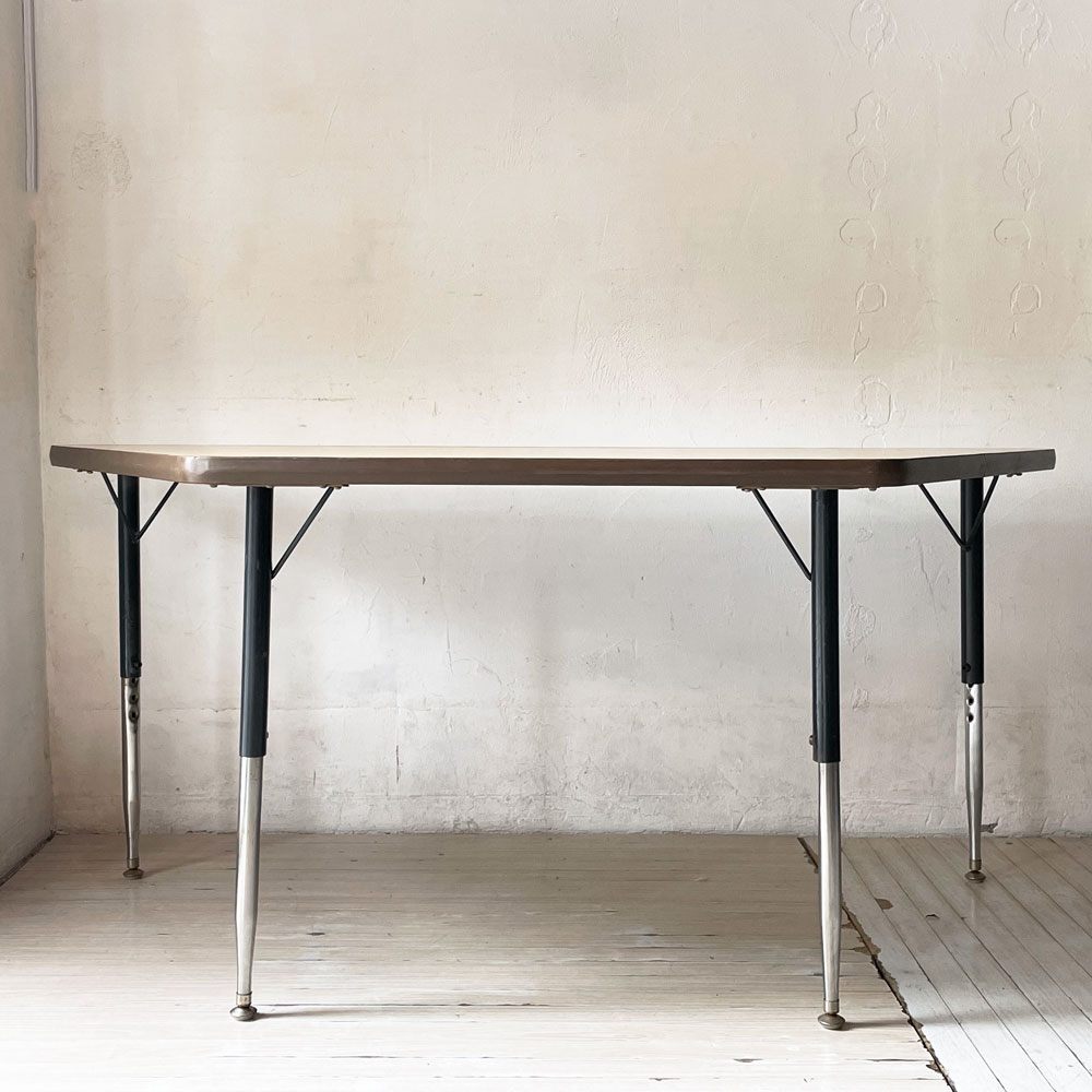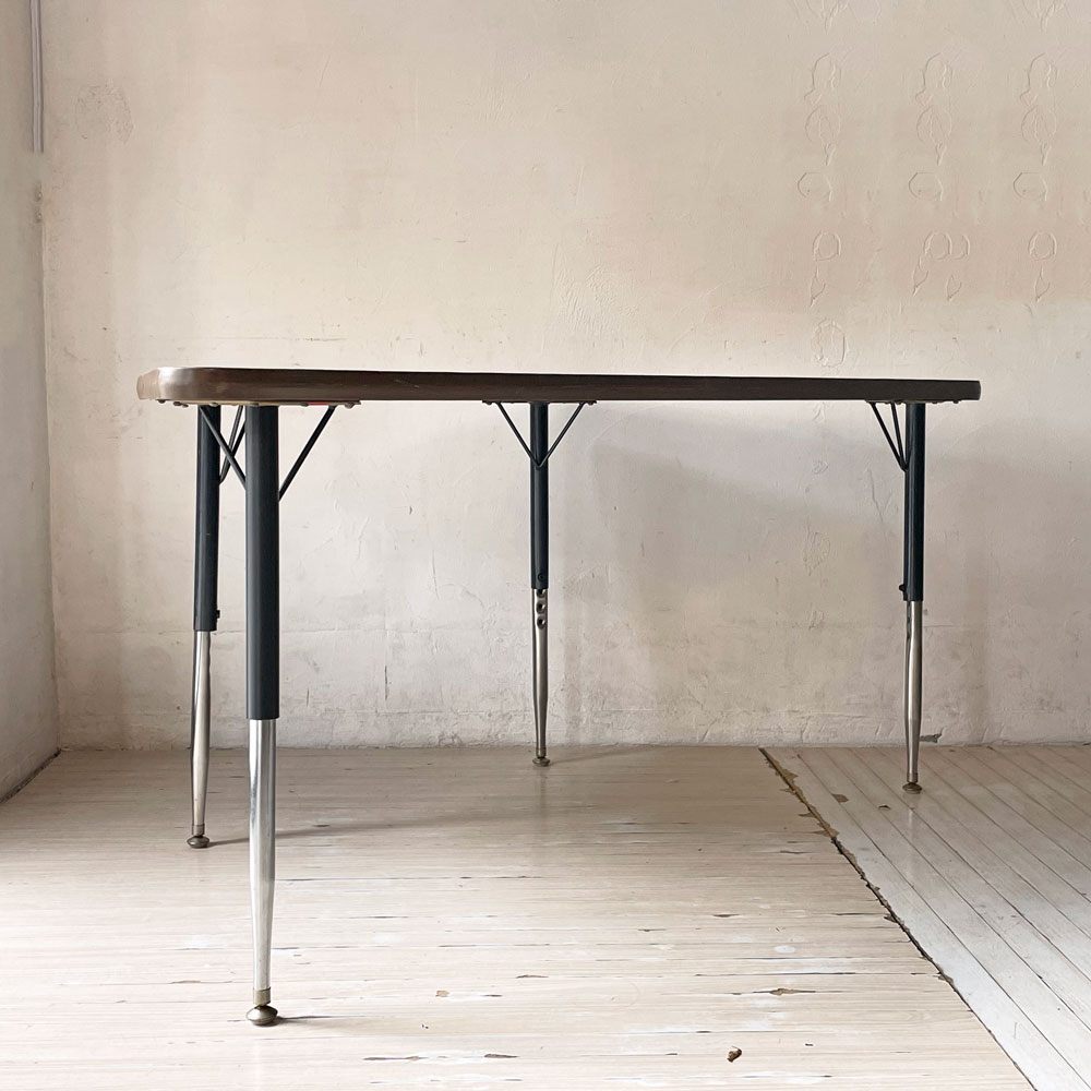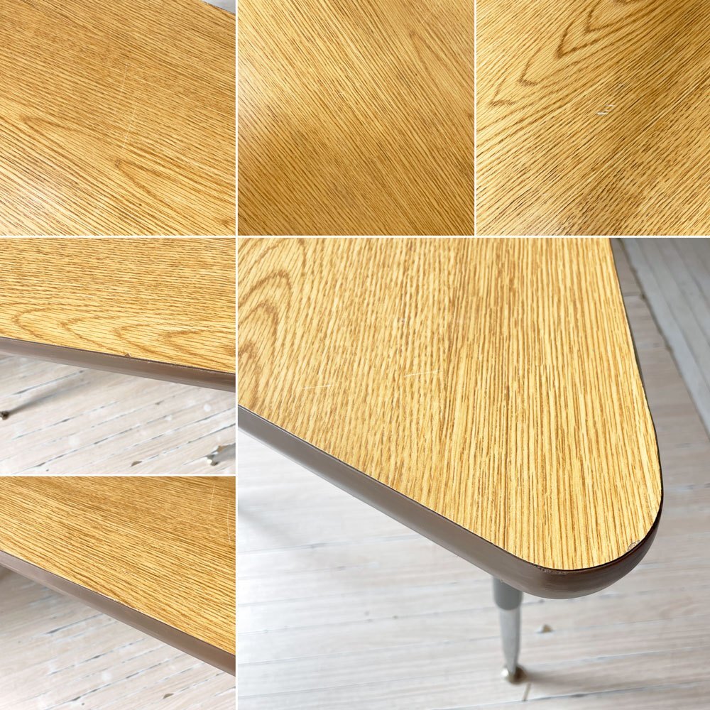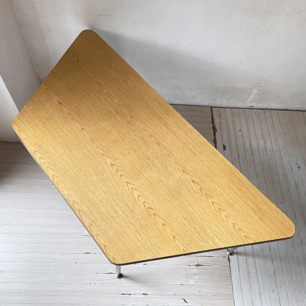 | コメント | アメリカ国内のオフィスや学校、公共施設など様々な場所で広く使われているVIRCO社の4000テーブルが入荷しました。 実用性と耐久性に優れた4000テーブルは、長きに渡りアメリカ国内はもちろん、国内外でも高い評価を得ています。 US家具らしいシンプルで無骨なフォルムに、天板はレトロでビンテージ感のあるオーク材の圧縮合板の組み合わせ。 また、こちらは台形型の天板がユニークで良いアクセントになった一品です。 天板縁周りはブラウンカラーのリムが施されており、ミッドセンチュリーデザインを彷彿とさせてくれます。 スチールの脚部は高さ調整機能を備えており、9段階の高さ調整が可能。使う人や用途によってテーブル高さを変えられます。メタリックな脚部はシャープでスタリッシュな特徴的なデザイン。 パブリックスペースやオフィス、ダイニング空間やワークスペースなど、様々なシーンに溶け込むUSミッドセンチュリーデザインのVIRCO社の4000テーブル。 古き良きアメリカを感じさせる、タフで堅牢な造りのテーブルとなっております。 ※当ショップは、主にリサイクル品を取り扱っております。基本的にUSED品である事をご理解頂き、ご入札をご検討下さいませ。 |