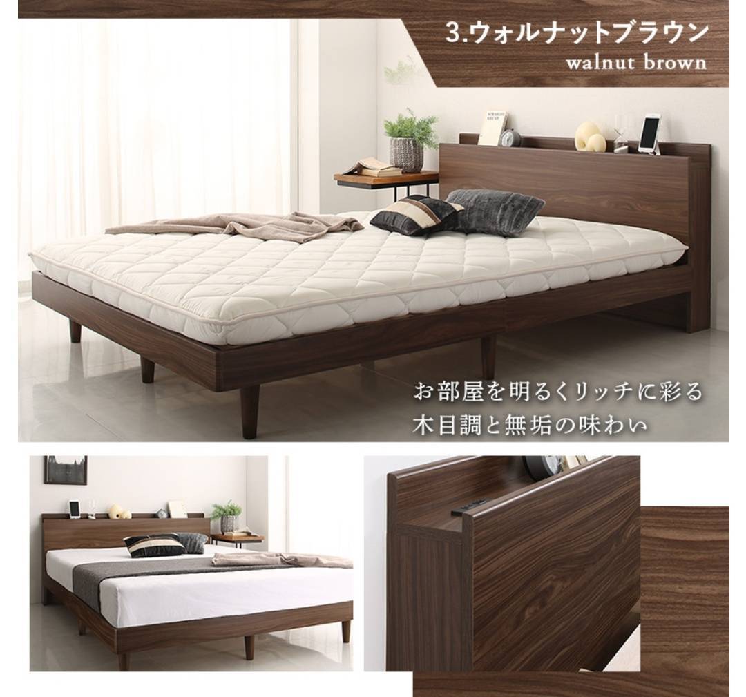 フレームのみ【アウトレット品】ダブル NEWすのこベッド・棚2口コンセント付き ウォルナットブラウン