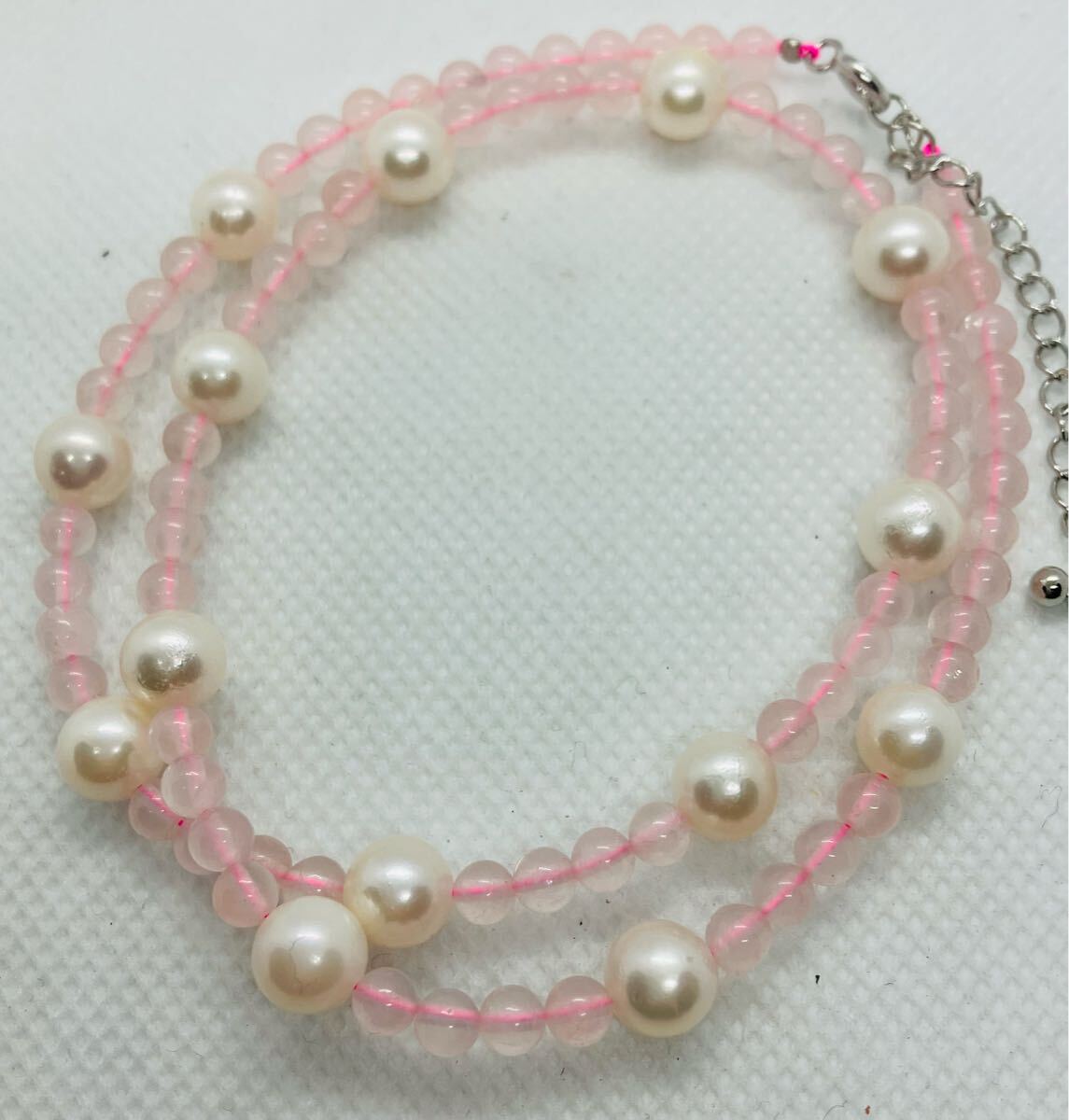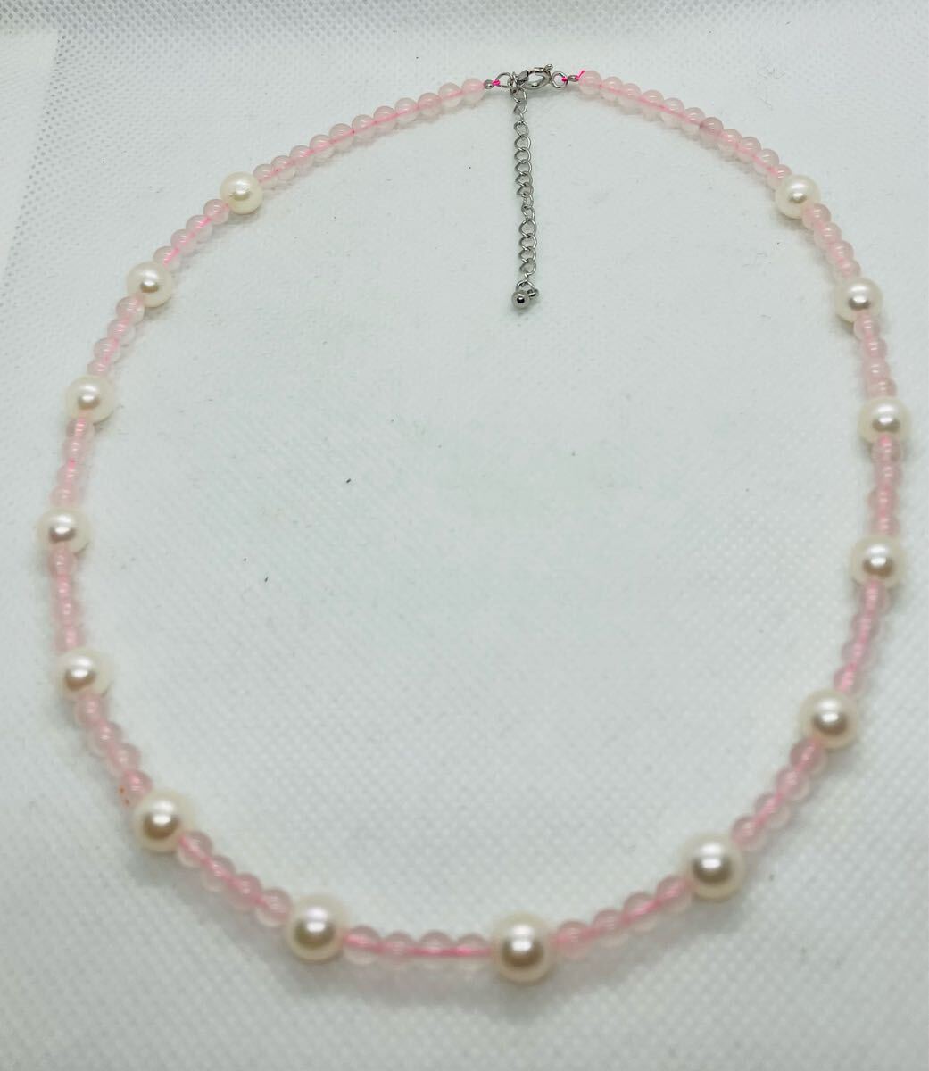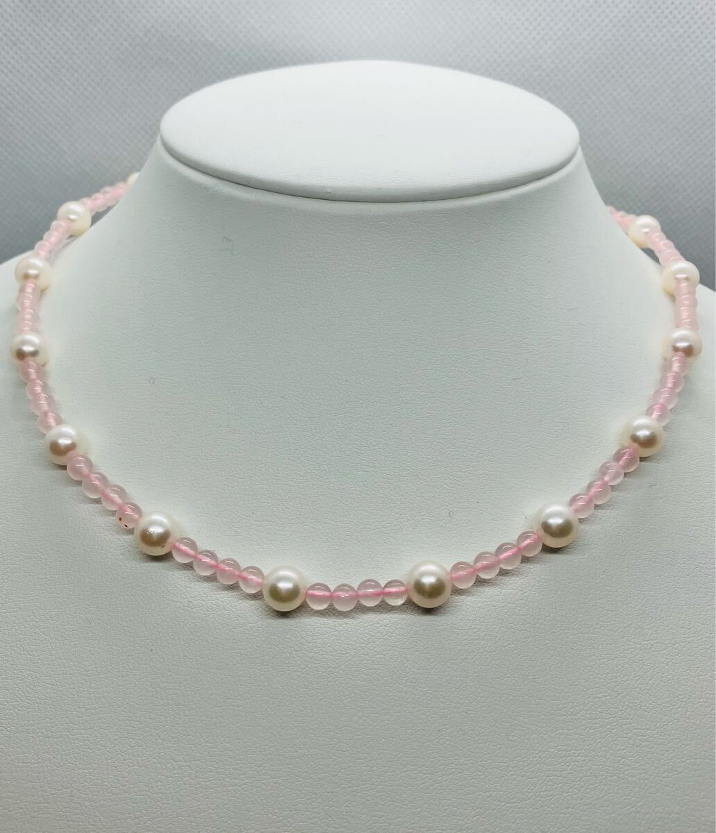 アコヤパールの白色の7ミリから7.5ミリまでを、14珠使用して、3ミリ丸珠ローズクォーツに等間隔に配置したステーションネックレスです。全長は、42センチに5センチのフリーアジャスター付きとなります。