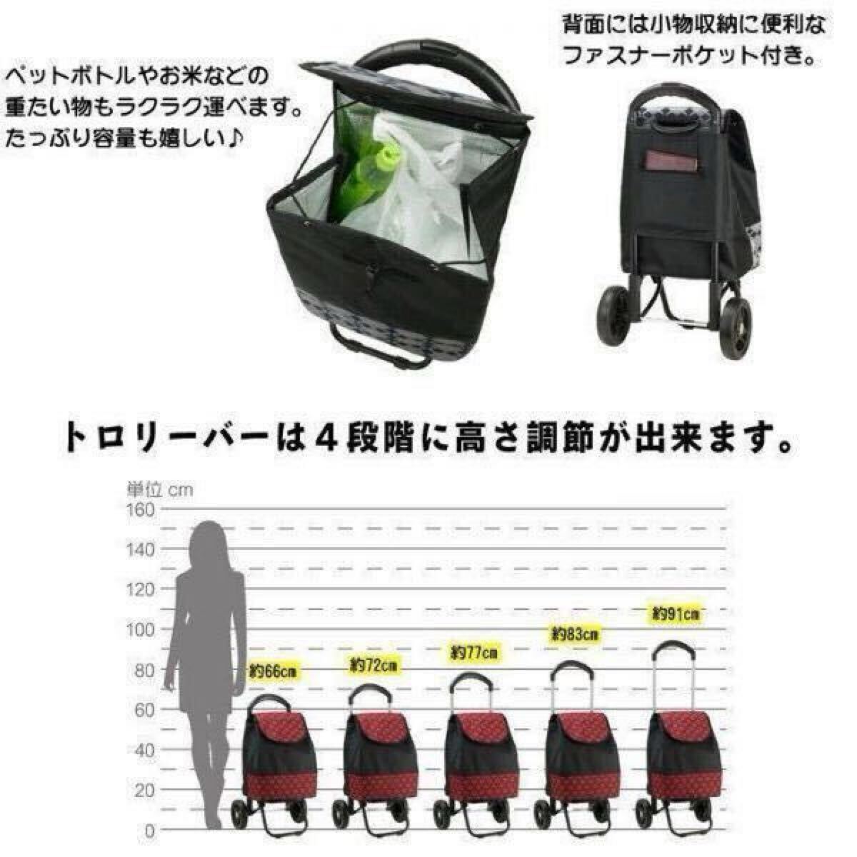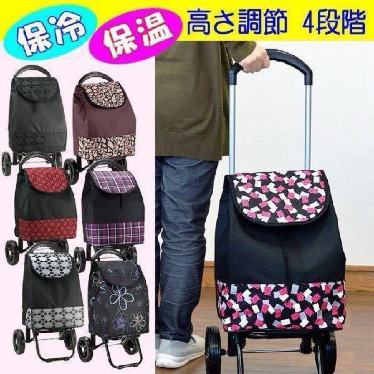 ブランド VALENTINO VISCANI ヴァレンチノヴィスカーニ●内装に断熱シートを使った保冷・保温効果のある軽量ショッピングカートです。●持ち手は4段階に高さ調節ができるので、どなたにも使いやすい仕様です。●お買い物が楽しくなるおしゃれな選べるカラーも充実していて、 女性はもちろん、男性にもおすすめです。●折りたみ式でスーパーのカート(下段)の収まります。●大きな車輪で動きも滑らか。重たい荷物も楽々運べます。◎サイズ:約高さ66×横幅35×厚み31cm
